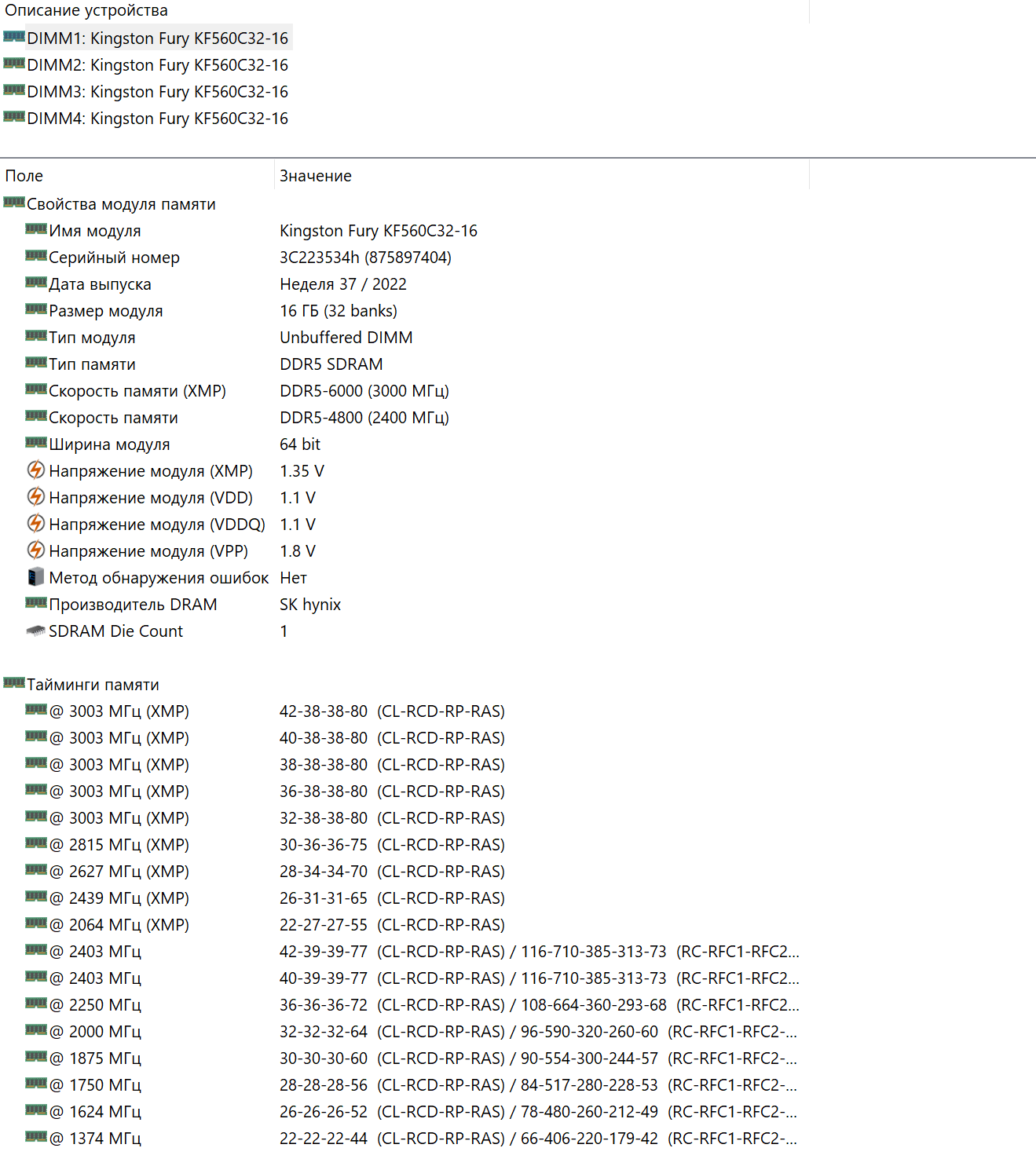 Вот тут можно почекать би даи по маркировке ОЗУ. https://benzhaomin.github.io/bdiefinder/ Недавно сам купил как дурак гскиллы с17 3600 2x16. С такой же маркировкой как у меня. Только вот у меня кит на 16 гб был и там би даи, а тут попались Hynix CJR C-Die. Естественно на XMP они не завелись. Стартанули без ошибок на с17 3466. Буду пердолить, щито поделать. Возвращать не буду так как покупал в магазине через Авито