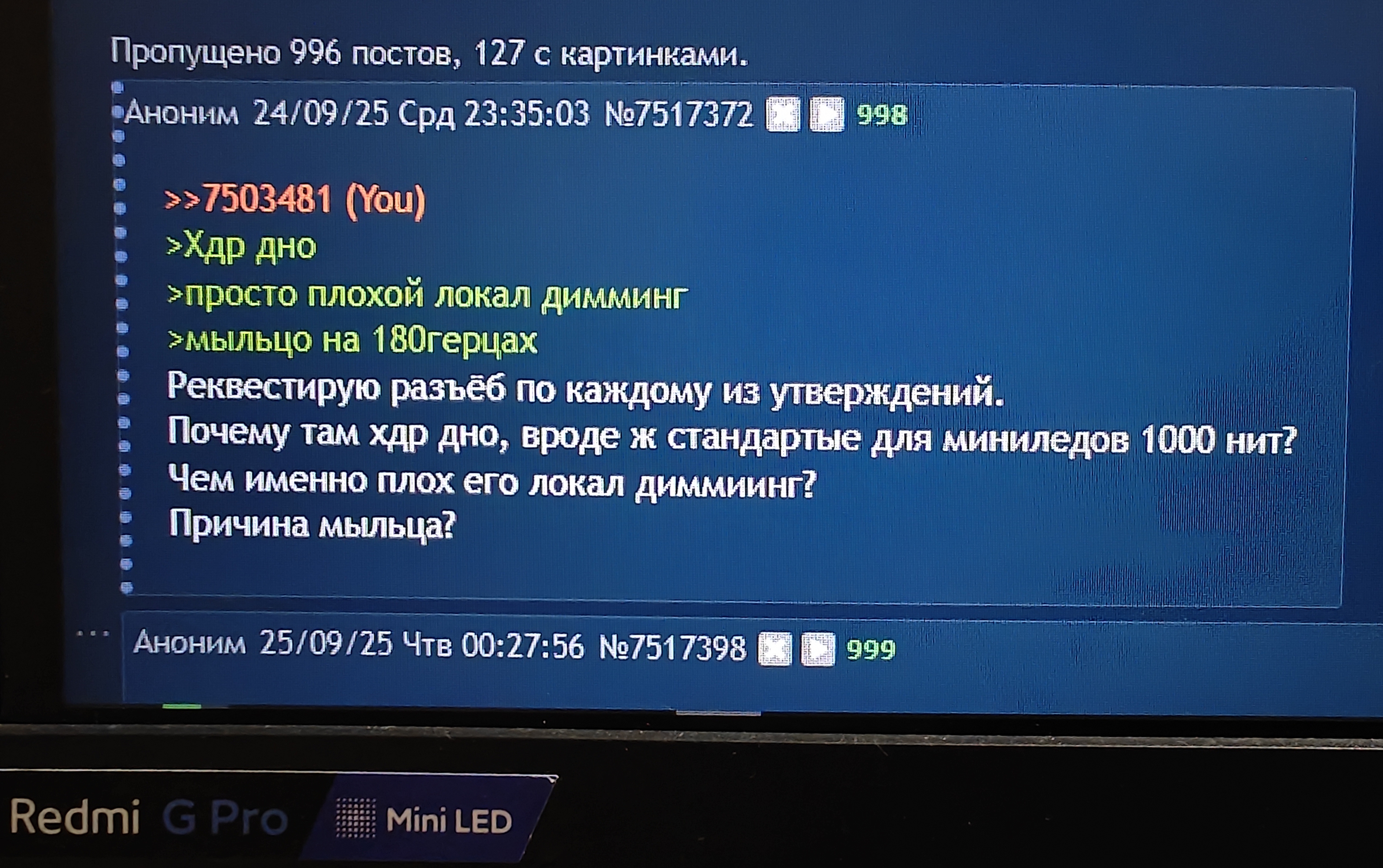 б) В текущем виде miniled как технология c 1000+ зонами подсветки и нормальными алгоритмами - годнота, одобряю. Внезапно, глоу эффекта вокруг элементов практически нет или он на уровне еле уловимости. Из явных проблем осталось только тусклость маленьких элементов, но положа руку на сердце - лучше это, чем ебучие засветы по краям экрана 24/7 по краям монитора (что для меня как любителя темных тем и ночного образа жизни особенно важно). Одним словом, не OLED, но как костыль для глоу-ips - оче годно.