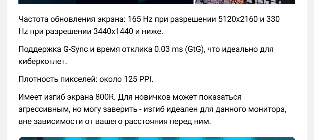 >>7529875 не понимаю смысла таких моников. есть телеки 4к больших размеров для ютуба и видосов или гоночных игр с рулем. есть моники меньшего разрешения и размера для динамичных игр типа шутанов. а тут моник размером с телевизор на кухне - ни рыба ни мясо. для контр страйк не годен, слишком большой, для ААА игрулек - не потянет железо. то моник для игр из нулевых что ли?