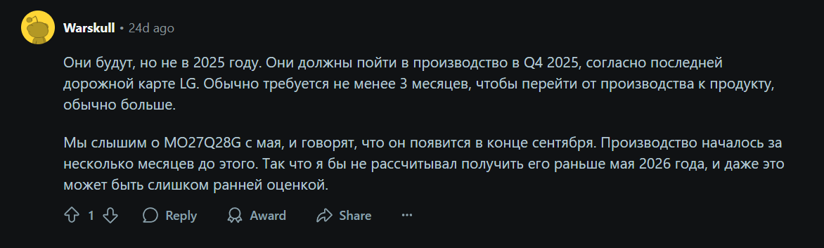 Отменили кароч мне заказ в компуктерюниверсе Напугали вы меня этим глоу и ареолами, а мож зря ( хотя энивей рот ебал ждать моник который только ОТПРАВЯТ мне в октябре и придёт к ноябрю ) Оледами пугают шрифтами ебаными в 2к, на 4k чото жалко кучу евров отдавать и трястись что он там выгорит Хуйня какая-то с вашими мониторами кароч в 2025 Чо, ниче лучше 10 летнего не ag271qg не найти чтоли мне за ~700 еврофантиков ? Играю в игори с VRR , скролю двачи, фильмы смотрю на самсунге вместо телевизора и вот под такой скудный спектр задач нет ниче чтоли? бля какая хуета