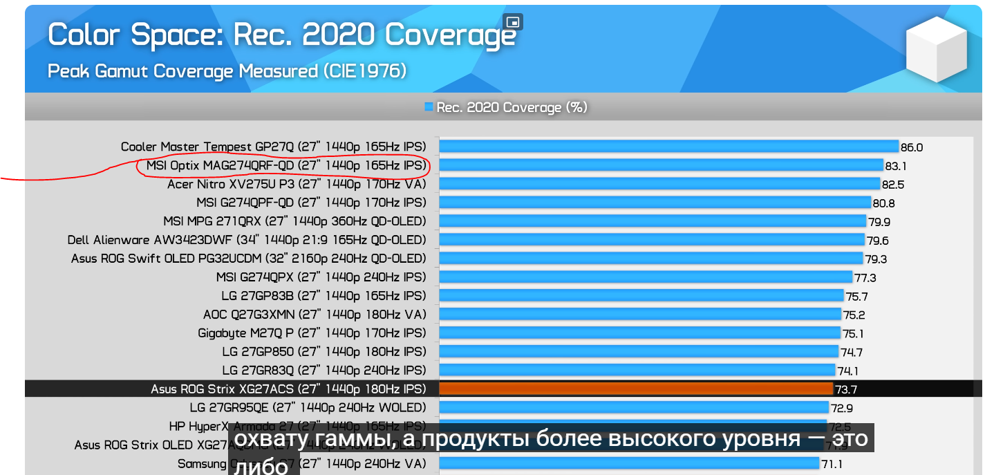 >>7526785 > Asus XG27ACS Он старый, цвета на видосах хорошие, характеристики старые, начальная цена бюджетная 30 тыщ надо найти че нить что стоила 100к а сейчас 30 если из старого, чем старше монитор тем сильнее искревляют гамму \ То что с миниледом это уже другая модель, самый топ это ACS там 98 п3, а все остальыне модели АСG или ва или 240 герц они все с потерей цвета почему то 95 п3 а это знаичт цвета ниже среднего будут