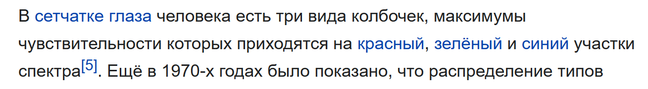 >>7515443 >Слушай, но ты же берёшь откуда-то эти замеры и формулы расчёта. https://en.wikipedia.org/wiki/Human_eye Там с ссылками на источники все есть. кд/м² да и ниты можешь просто линейно перемножать: 1 кд/м² в два раза ярче это 2 кд/м², еще в два раза 4 кд/м², еще в два раза 8 кд/м² итд. Каждое повышение яркости в два раза - это ступень света, от чего ее отсчитывать - без разницы. Про то что все сюжеты воспринимаемые для человека это порядка 40 с небольшим ступеней помню с операторского факультета >Мы начали с того, что контраст не говорит ничего об уровне чёрного у дисплея, значение имеет только точка чёрного. Есть то что может показать дисплей и есть то, что может воспринять человек. Параметры глаза поменять мы не можем никак. Если экран, его контраст и яркость приближаются к границам того, что человек может воспринять в моменте, то это будет выглядеть хорошо и реалистично. Если нет - то будешь жаловаться, яркости там не хватает или что черный не черный. Контраст 1 000 000:1 у экрана говорит о том что самая яркая его точка в 1 000 000 раз ярче чем самая темная. 1 000 000 разделить на 2 двадцать раз это примерно 1, и это и есть примерно 20 ступеней, что достаточно близко к границам человеческого зрения (20-25). Соответственно существует уровень освещенности при котором такой экран будет восприниматься хорошо твоим глазом (в рамках абсолютных границ того, что человек может воспринять). В какую сторону отсчитывать 20 раз x2 - в целом без разницы, можешь от самой яркой точки, можешь от самой темной. Просто от темной немного логичнее т.к. чаще подразумеваем приглушенный свет.