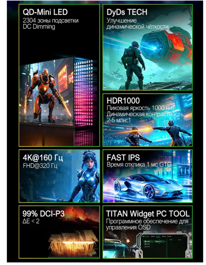 27" 4К ипс с квантовыми точками, 8бит+фрц, 96гц в 10 битном режиме, 256 зон подсветки, яркость 1000+ нит (по паспорту 1к, ирл 1,1к-1,2к), широкий цветовой охват, эмуляция сргб, нормальная калибровка изкоробки. Гсинк ультимат модуль следил чтобы адаптивная синхронизация работала в ХДР режиме, чтобы зоны подсветки быстро реагировали итп.