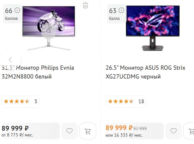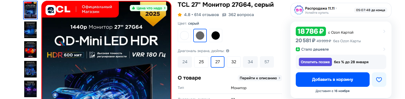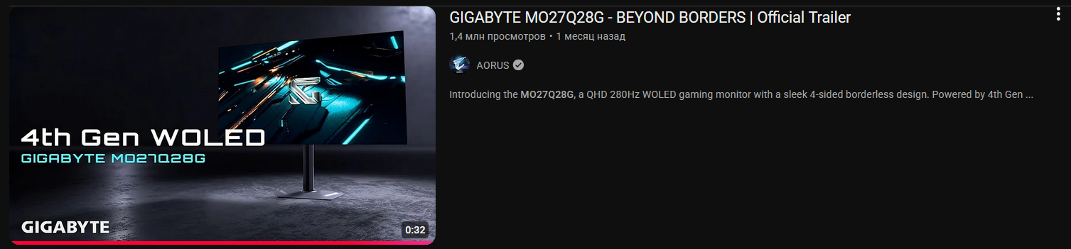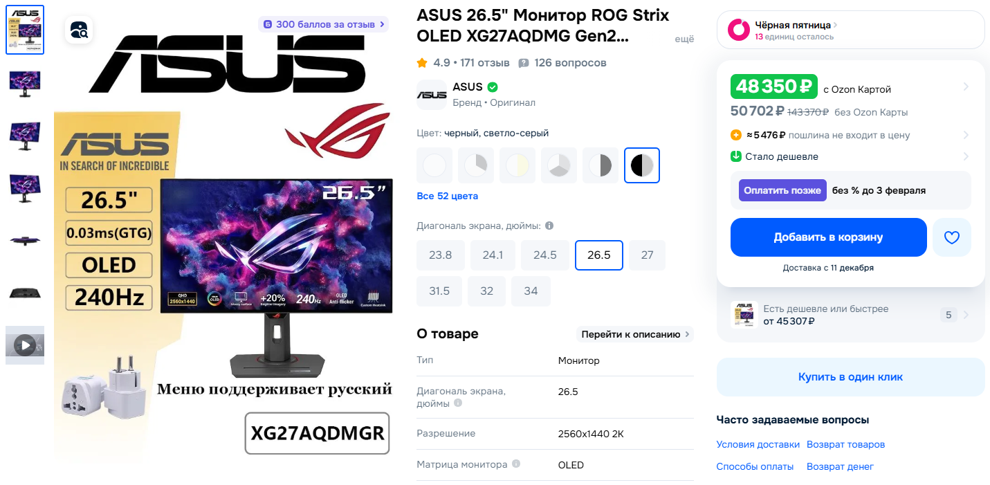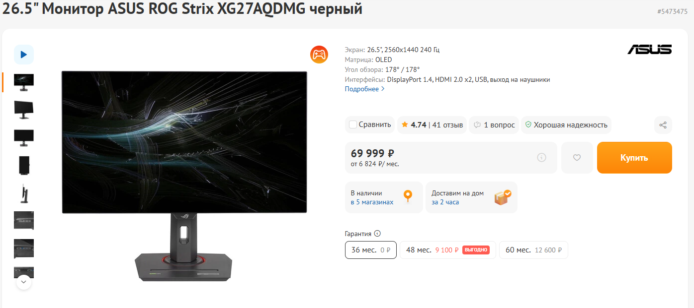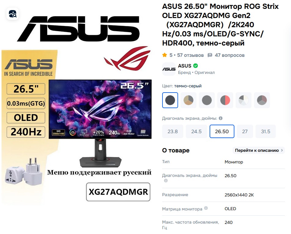 >>7557292 > Заодно компания представила 26,5-дюймовый монитор ROG Strix OLED XG27AQWMG. Он не умеет переключать режимы и работает только в разрешении 1440p при частоте обновления до 280 Гц. В остальном, за исключением версии разъёма DisplayPort (1.4 вместо 2.1a) новинка дублирует старшую модель. Розничная цена на мировом рынке — $599. Берем?