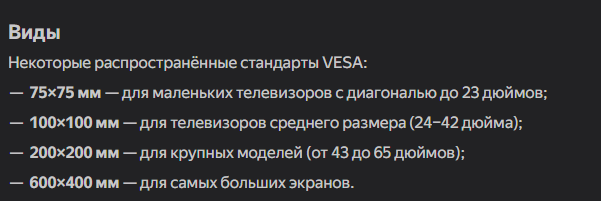 >>7571280 Не, тут дело в том что на мониторах и телеках большего размера крепления VESA уже больше по размеру у моников 17-30 это 75 или 100 мм, у телеков больше уже выше. Хотя у тебя тут наебалово, телек 32 и моник вполне может иметь 100х100 крепление. Так что до 32 скорее . а не до 30
