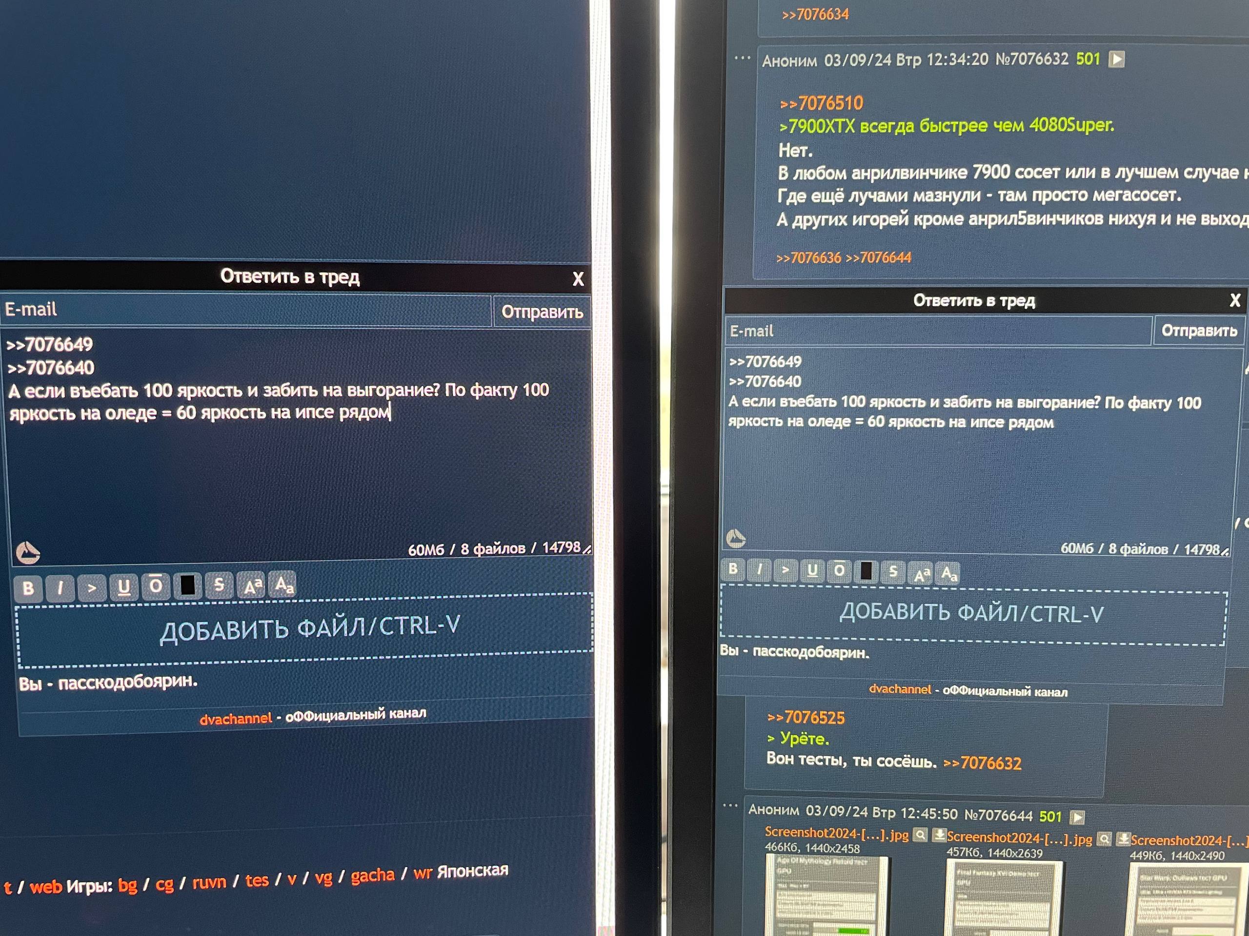 >>7618265 Бля еще раз повторяю, пострадает вон ровно та часть, где отражается светлый объект. То есть это конкретно твое окно. У меня одно из них всегда блекаутом закрыто, открыто только второе и вот его я вижу в отражении. Засвет на прилегающую часть экрана это считай не дает, надо вглядываться, и фото в этом аспекте пиздят. На них посмотришь, так если у тебя в комнате просто ярко, например включен верхний свет, то все, олег будет как зеркало. Нет, не будет, ирл это даже близко так не выглядит. В общем, достаточно просто не сидеть спиной к сильному источнику света. >>7618267 >Нитак сидишь Шиз, на матовом это тоже будет как говно, просто иного сорта. На глянце ты видишь источник света как в зеркале, на моем ипс матовом это тупо как засвет, пятно. И тут еще поспорить можно, что из этого лучше. Сидеть напротив источника света в целом плохая идея, но в моем случае это вынужденность, пока ремонт не закончу.
