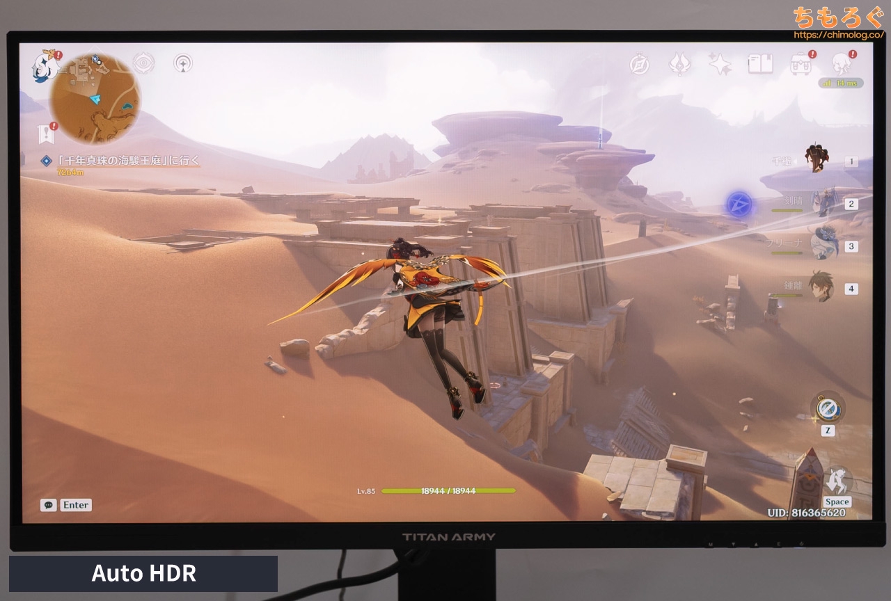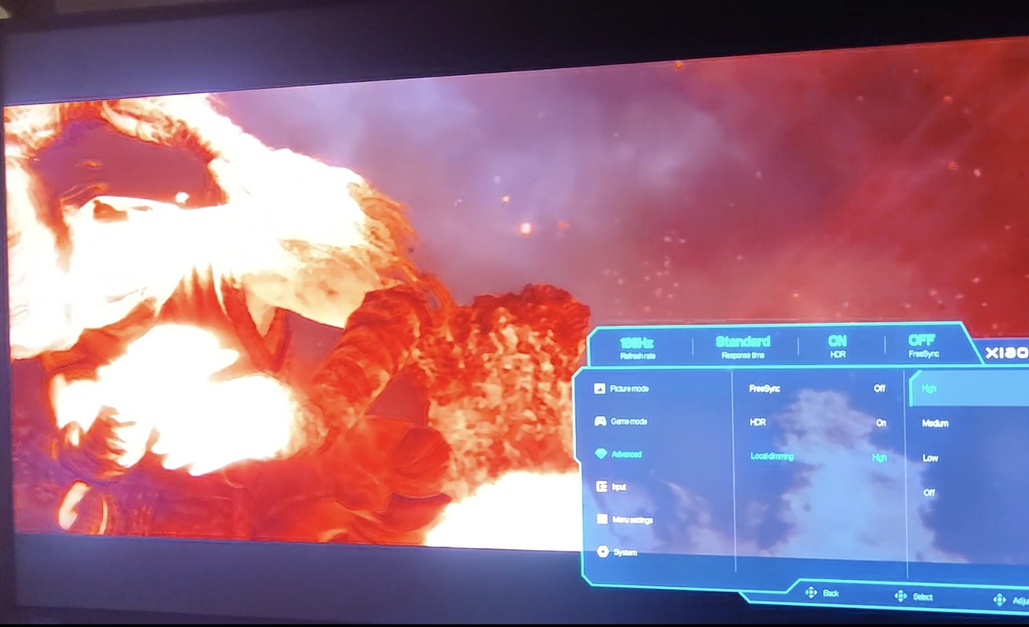 А вот здесь пожалуй самая большая разница, хорошо показывающая разницу между HDR400 и HDR1000. Низкий диапазон яркости не позволяет оледу подсветить отдельные элементы картинки разной силой, и все сливается в белый пучок.