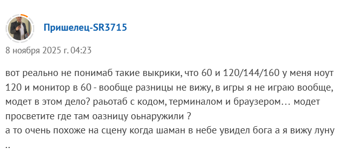 >>7626621 Так бывает, когда твой прошлый манятор - VA 2015 года выпуска, ты долго копил и наконец смог позволить себе мси или титан арми куди олед за 30к.