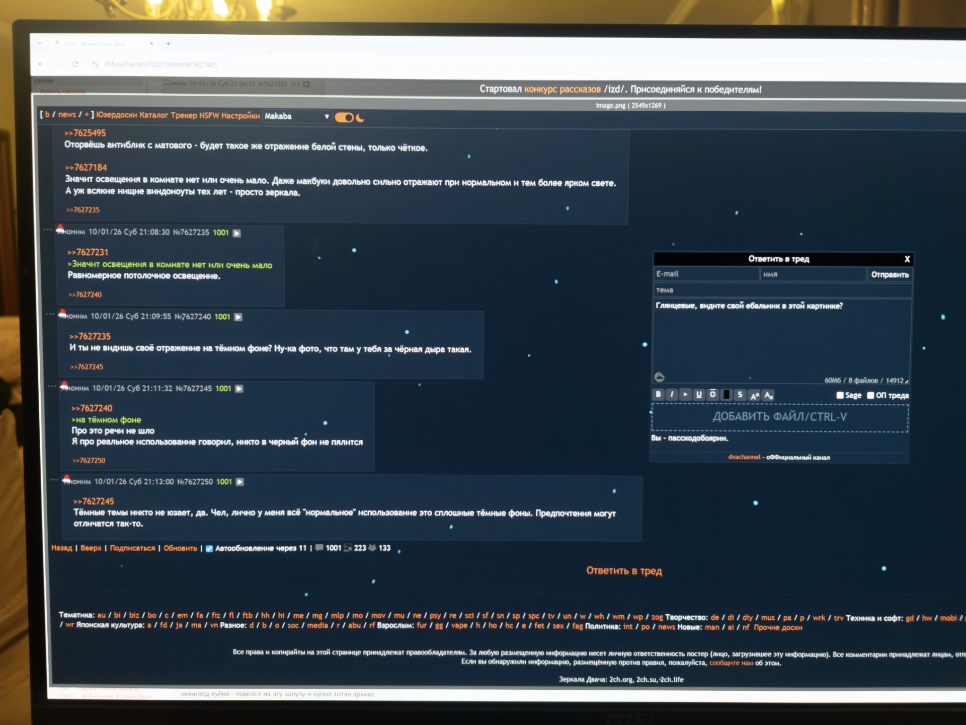 >>7627184 Значит освещения в комнате нет или очень мало. Даже макбуки довольно сильно отражают при нормальном и тем более ярком свете. А уж всякие нищие виндоноуты тех лет - просто зеркала.