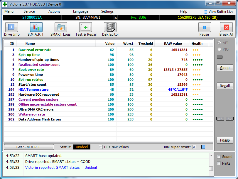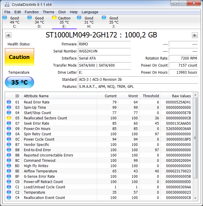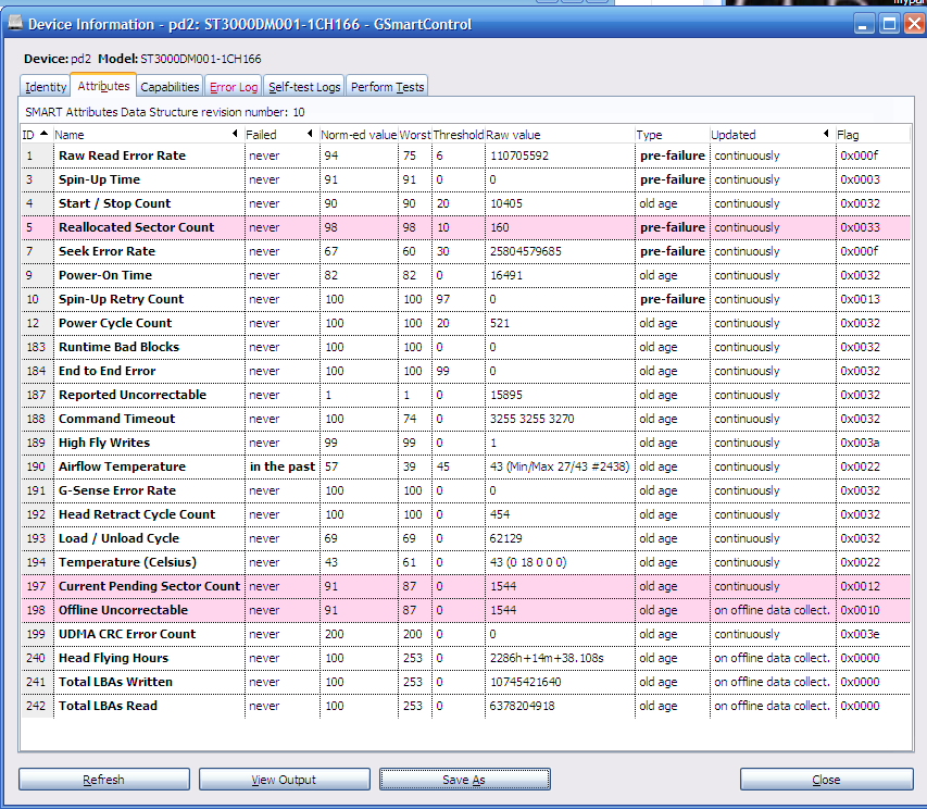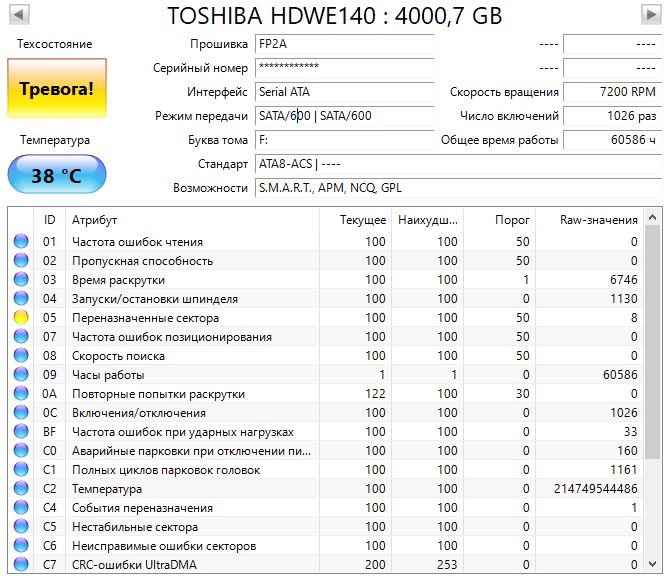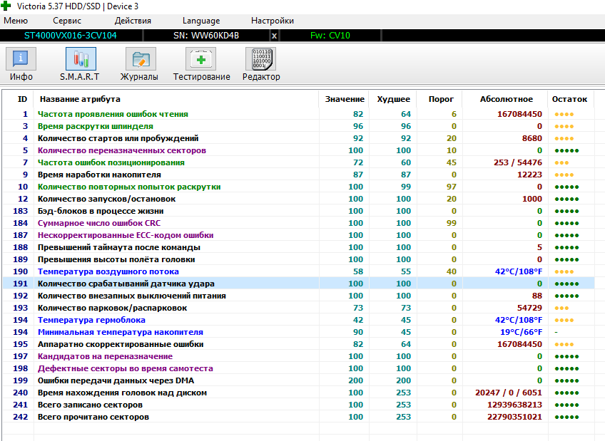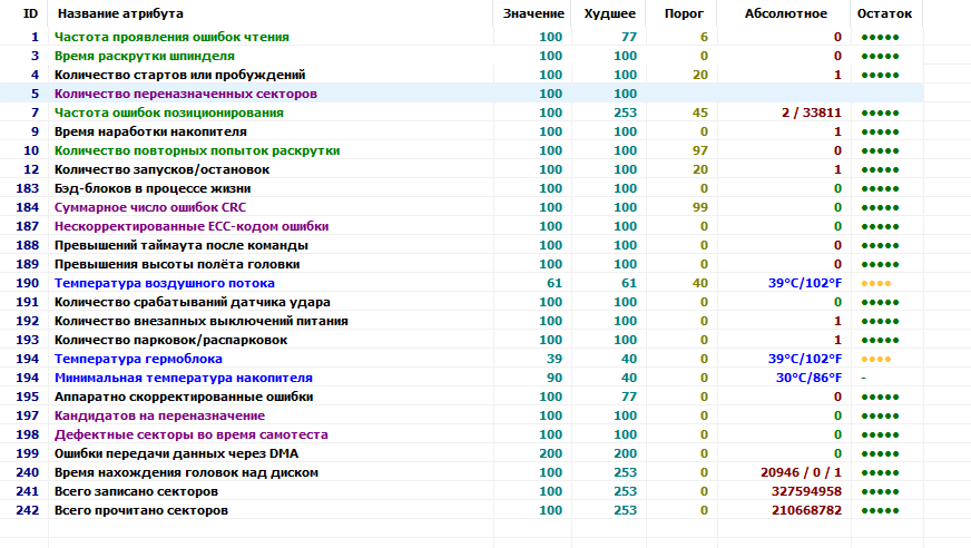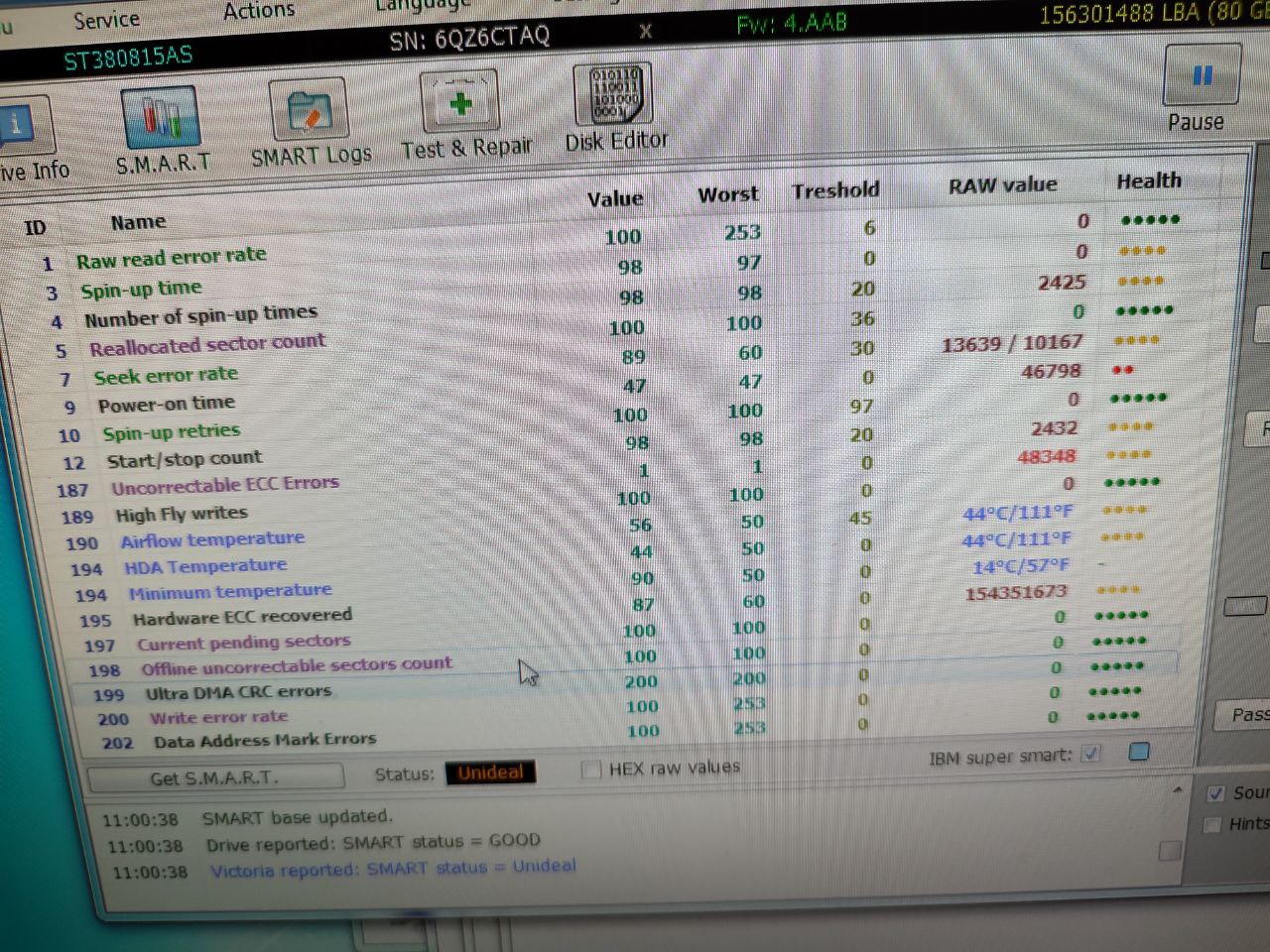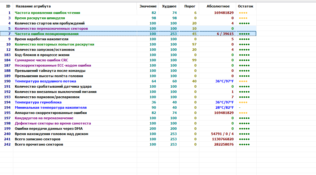 Я бы не парился, насчет выделенной сточки на скриншоте - у них seek error рисуются своеобразно в SMART - там счетчик всех операций поиска/чтения и это число надо в 16-чную систему счисления переводить и при этом последние 8 разрядов числа ничего не зачат, и лишь если число совсем астрономическое, то есть больше 8-ми разрядов, то вот это будет числом ошибок. Короче, вот он тебе показывает десятичное число - охулиарды какие-то, если перевести это в hex будет FF8F999A3 - то лишь первое F будет означать число ошибок 15 штук, а остальные восемь цифирь просто счетчик. Как-то так.