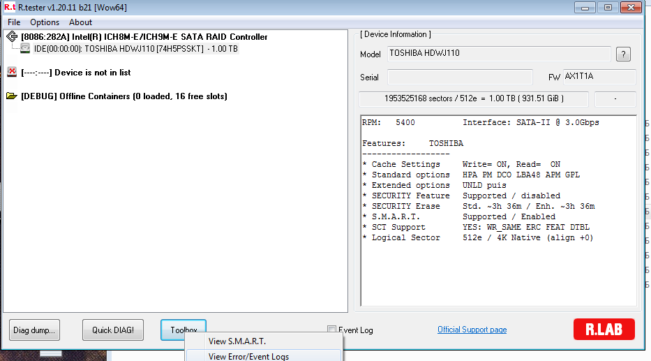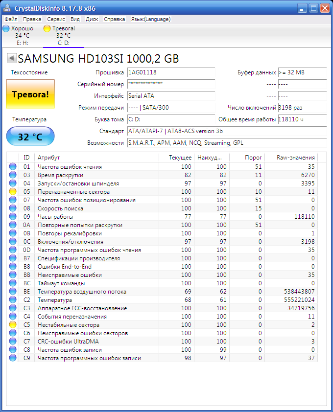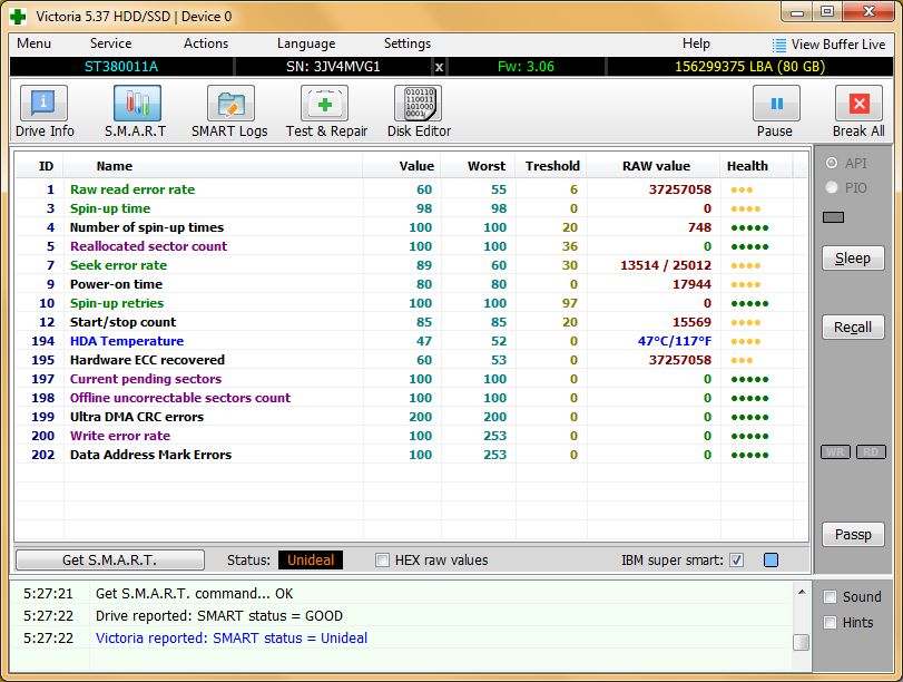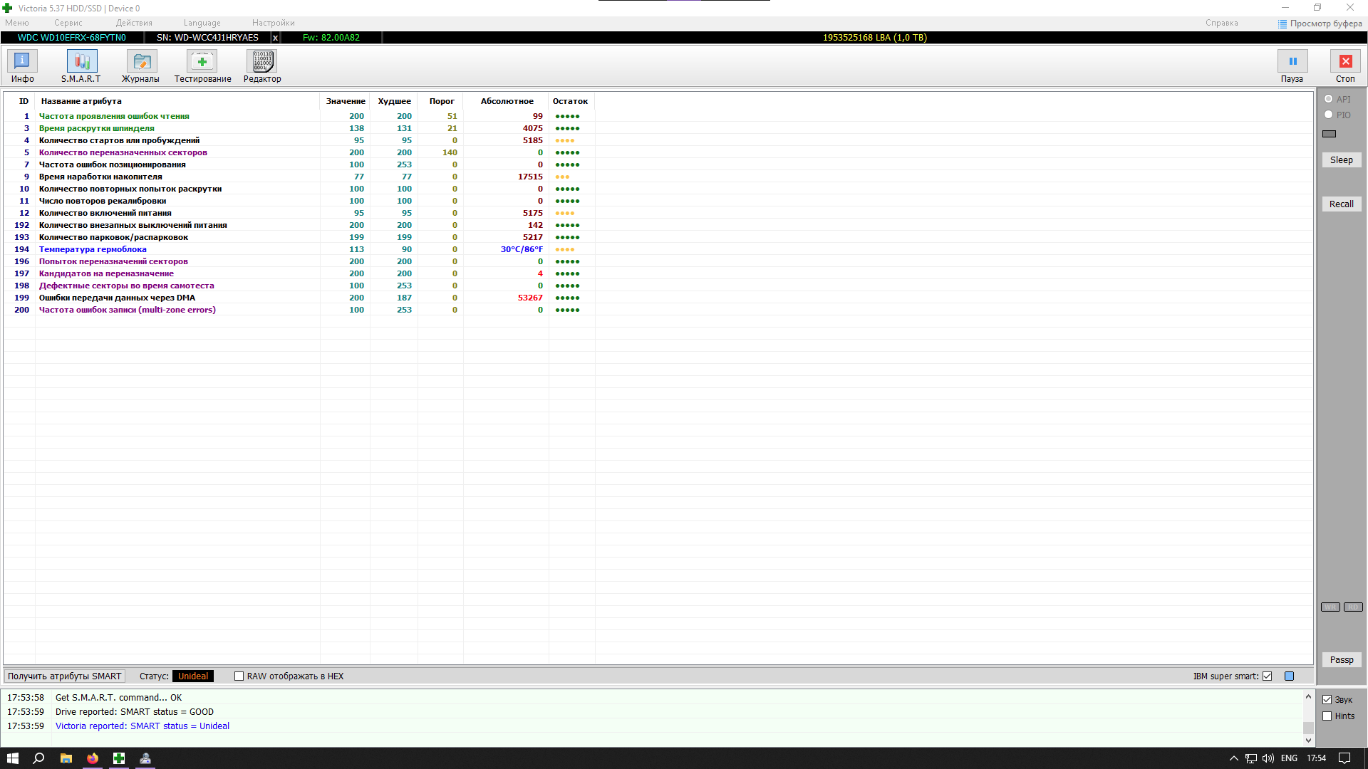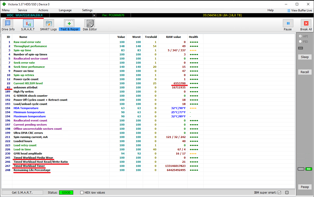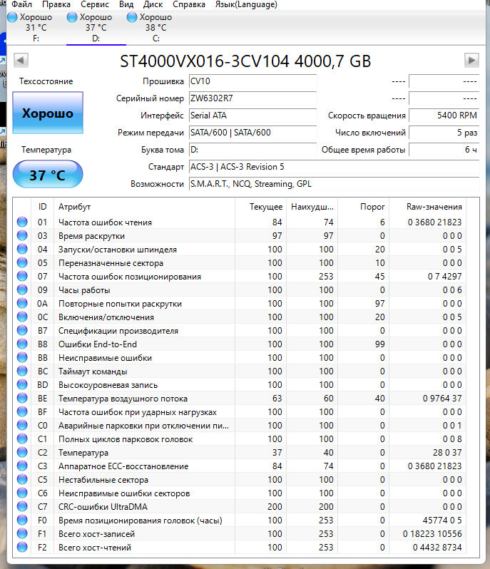Я бы не парился, насчет выделенной сточки на скриншоте - у них seek error рисуются своеобразно в SMART - там счетчик всех операций поиска/чтения и это число надо в 16-чную систему счисления переводить и при этом последние 8 разрядов числа ничего не зачат, и лишь если число совсем астрономическое, то есть больше 8-ми разрядов, то вот это будет числом ошибок. Короче, вот он тебе показывает десятичное число - охулиарды какие-то, если перевести это в hex будет FF8F999A3 - то лишь первое F будет означать число ошибок 15 штук, а остальные восемь цифирь просто счетчик. Как-то так.