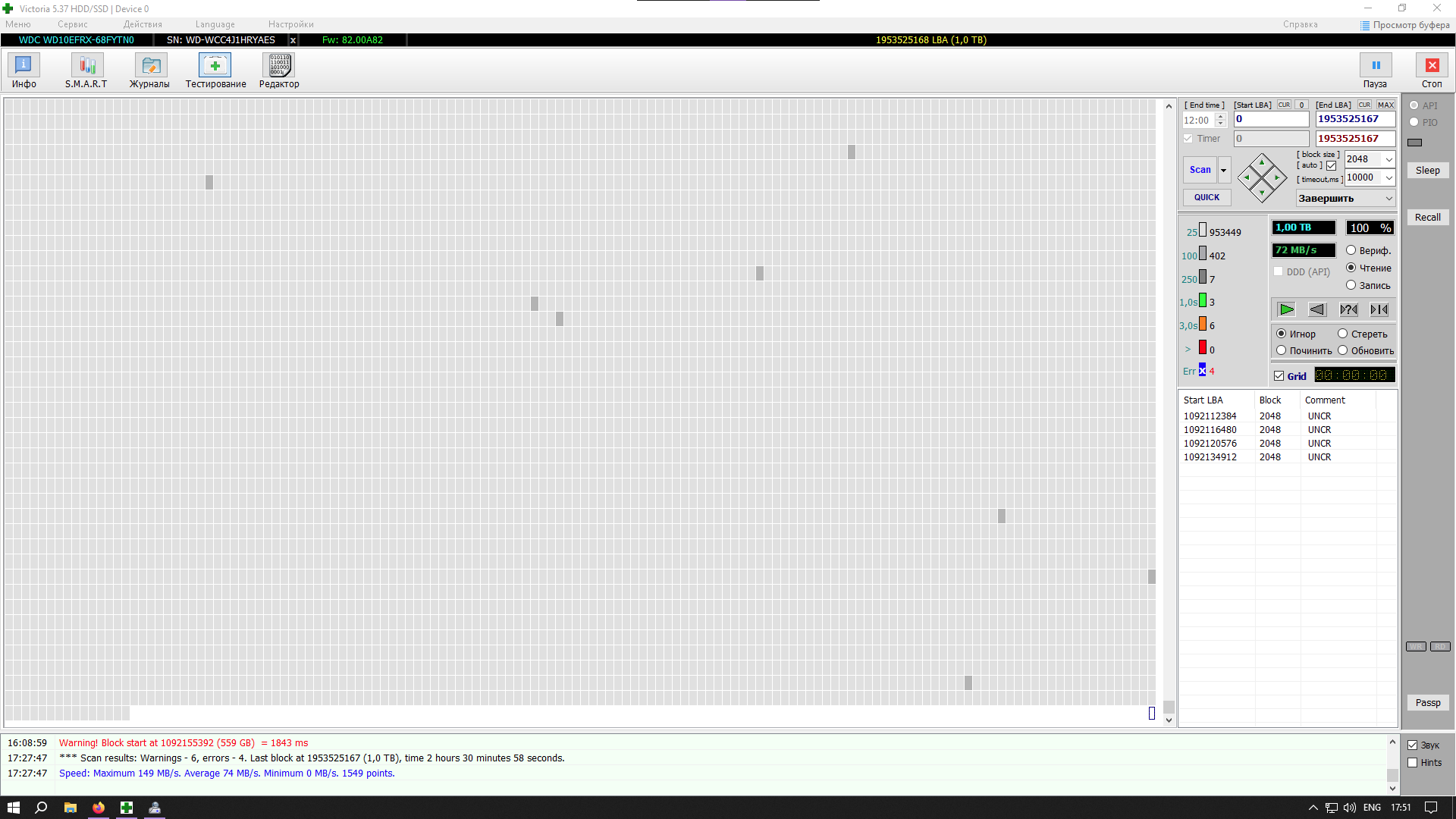 >>7339902 → >WD43PURZ О, это я "удачно" купил 4тб в прошлом году. Диск - говно-говна, рассыпается на глазах, пукает ошибками чтения и я пошёл нахуй. Ошибки компактно сконцентрированы в начале диска и в середине, вначале помогли неразмеченные 10гб (на которые похуй), в середине планирую сделать то же самое и посмотреть, насколько меньшей длины хуй придётся терпеть.