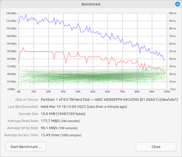 Eсть 2 WD Purple (на 2 и 6 тб) и даже не понятно это CMR или SMR если судить по этому графику (почему в некоторых участках появляются "сосульки" как на SMR дисках), не смотря на то что по паспорту это CMR. Читал что недавно начали производить какие-то псевдо-CMR (со статичным T2 модулем на 190).