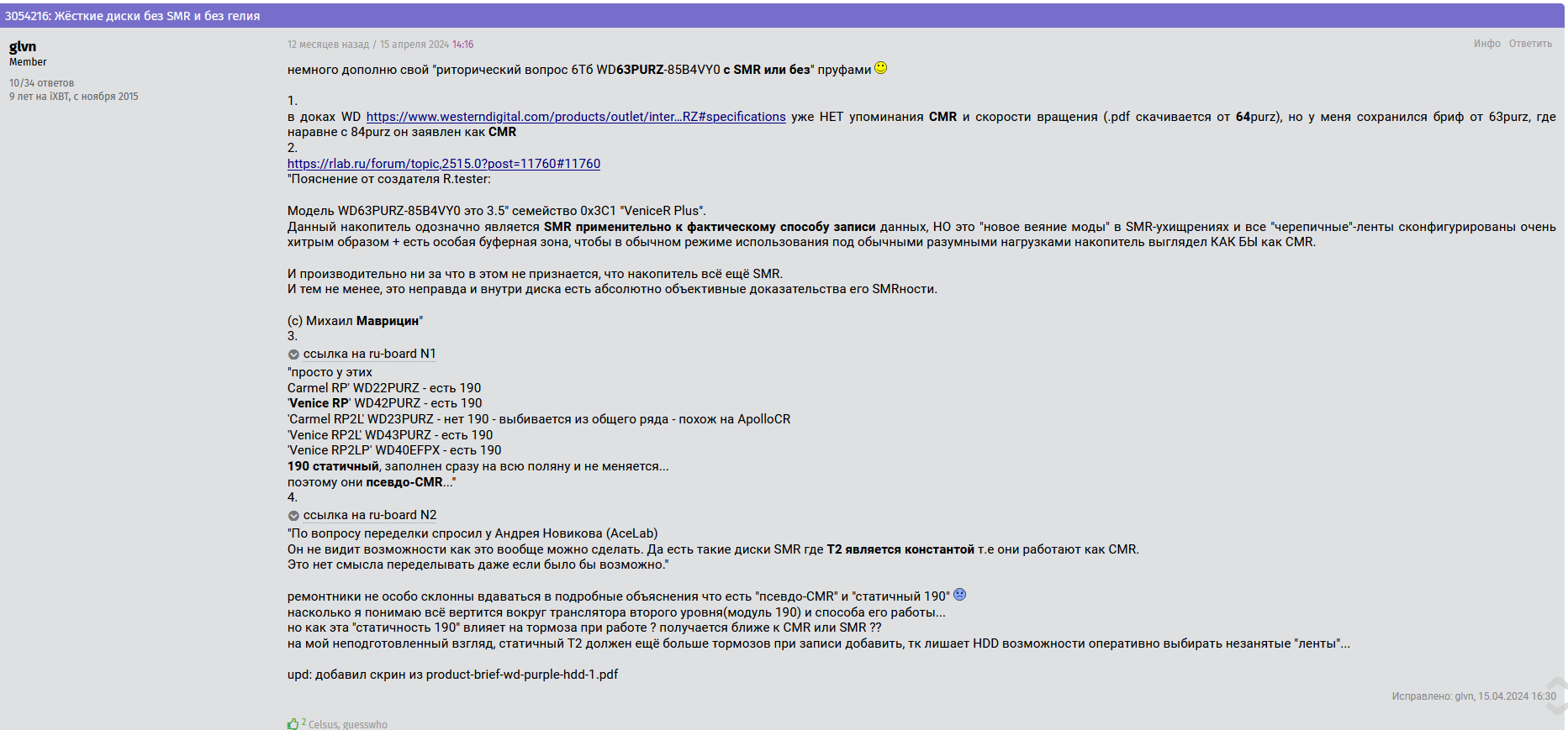 И выяснил несколько важных пунктов - все современные диски включая NAS кроме серверных принадлежат к семейству дисков Venice, Carmel, Apollo (дешевые платформы бывших SMR моделей) - гибридные SMR/псевдо-CMR с плотностью 2тб на пластину, со статичным модулем в 190.
