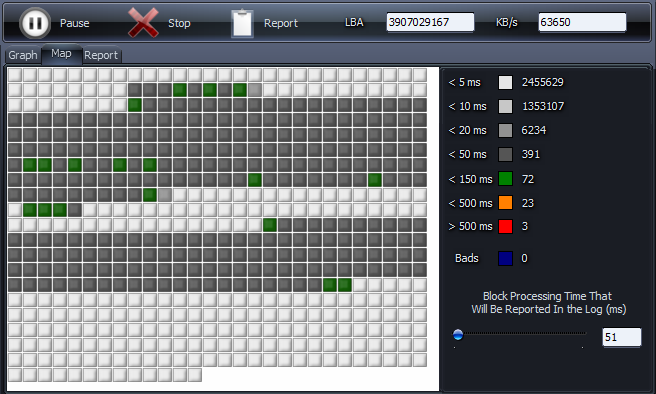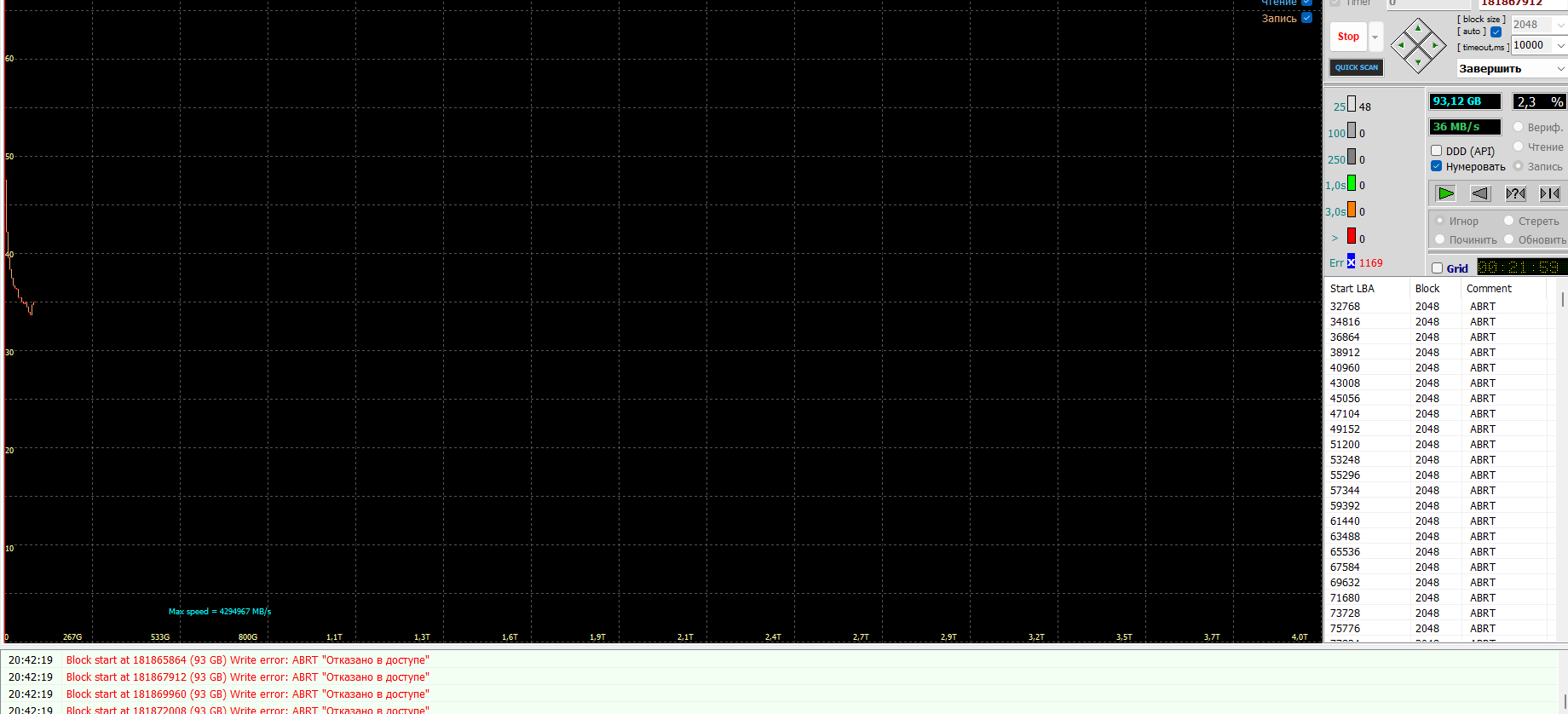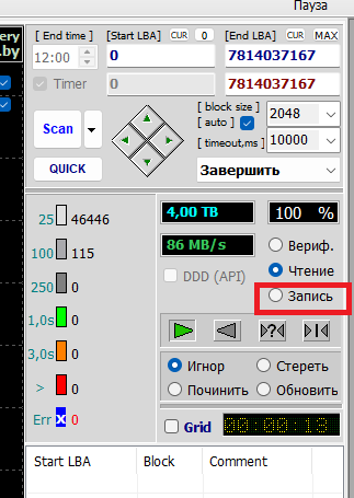 Теперь сделай тест записи. Вот под чтением находится где я красным выделил. Там должна быть коричневая полоска идти рядом с синей (чтением). Сделай оба теста и выложи потом.