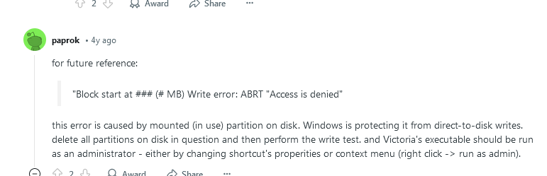 Хорошо, но вот ответ почему так вышло. Включается защита винды от случайной записи, викторию нужно запустить от администратора и удалить разделы диска используемые виндой. Но если не уверен как - не делай.