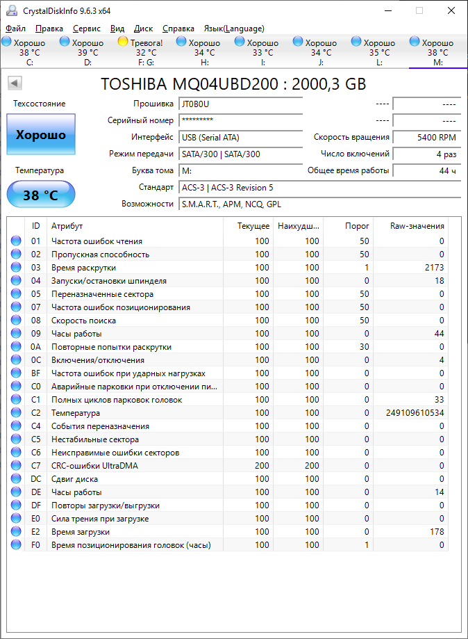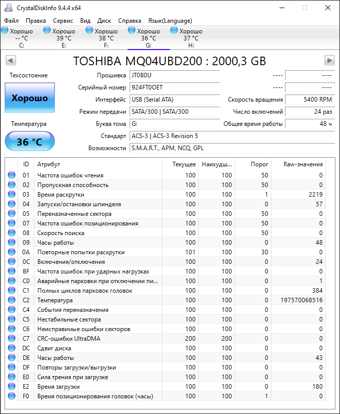 По смарту все норм. А данные на нем пропали, диск отображается в "мой компьютер"? У тебя какая версия виндоус? У меня такого если честно не бывало чтоб именно диск откидывался или чтобы логический том терялся, были проблемы с зависанием при копировании из-за плохого кабеля и интерфейса на втором диске или диск просто сыпался. Даже не знаю в чем тут дело. Может особенность данной модели. Она больше для непрерывной последовательной записи с игнором ошибок (хотя говорят это в режиме работы с камерами и специальным софтом, на винде это вроде не включается), может современные более менее дружелюбные с компом.