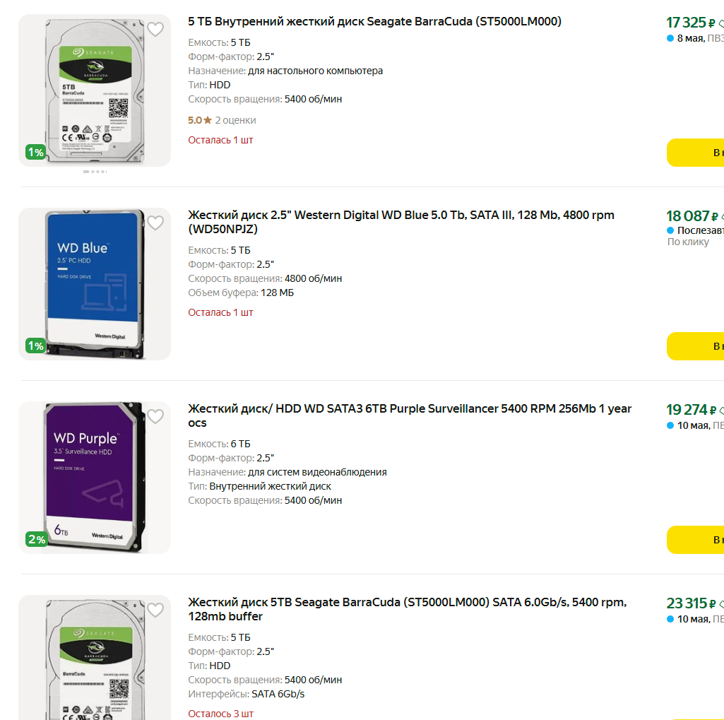 Дисков с малым объемом и оборотами 5400 уже почти не осталось как и обычных 2,5" cmr, у внешних нет сайта порта, хотя раньше это были обычные cmr диски со съемным интерфейсом. Идет бессмысленная гонка за большой цифрой типа MAMR/HAMR SMR объемом с 30 до 100тб, хотя лучше бы вместо этого производили миллионы обычных до 8тб