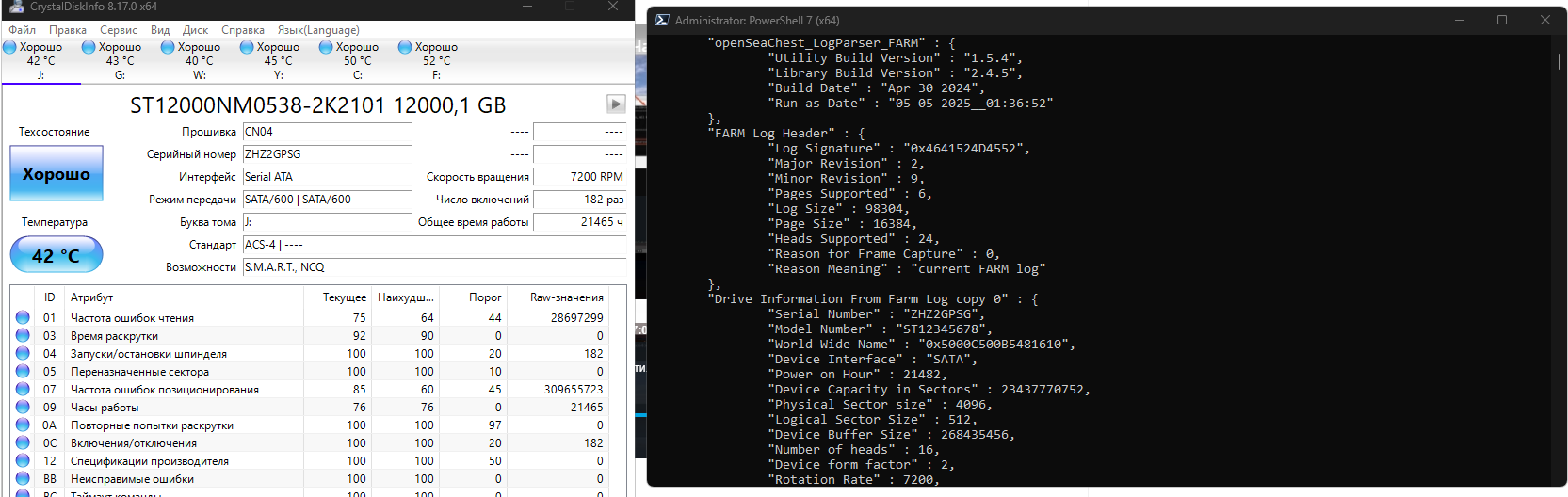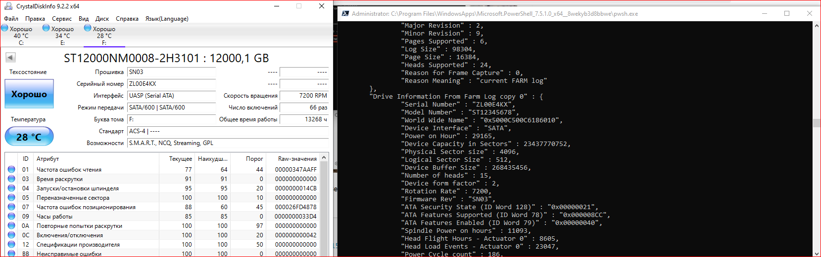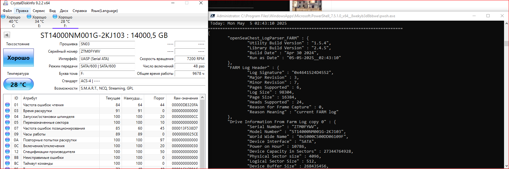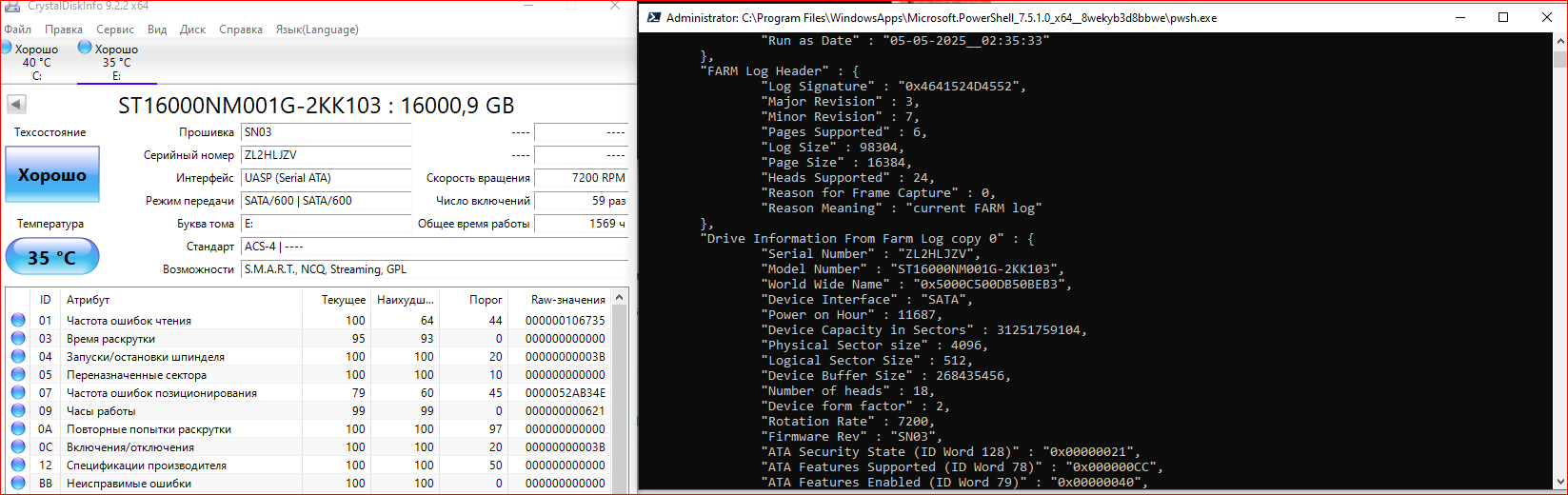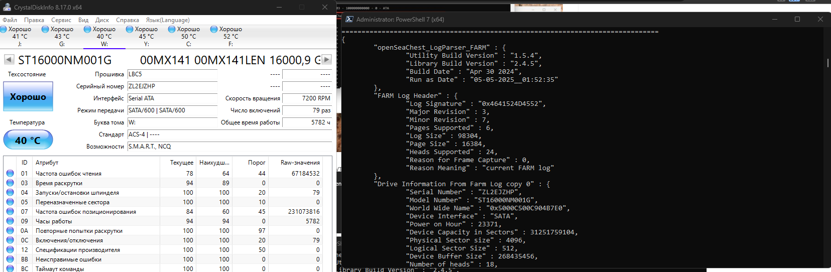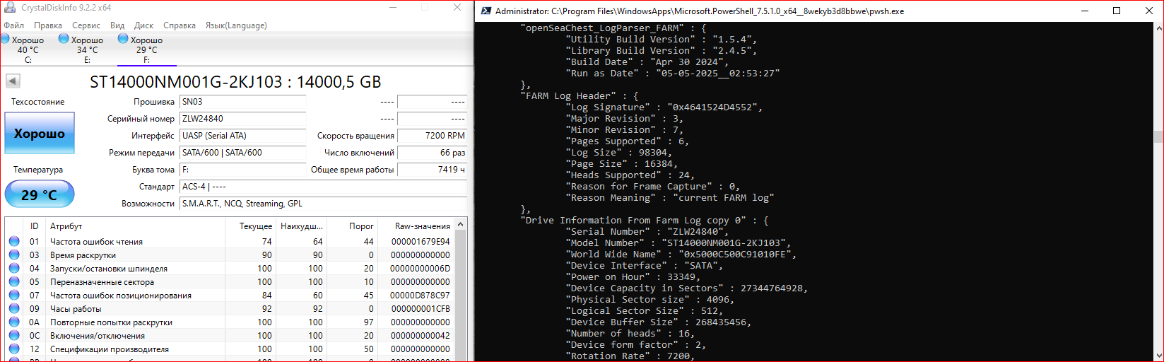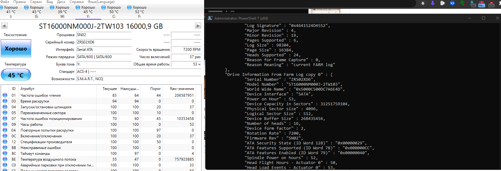 Это тот вчерашний Skyhawk отваливается? Данные пропали? На gsmartcontrol есть что-то в error log? Можешь показать скрин с CrystalDiskInfo, там тревога есть? Этот параметр 07. Seek error rate у seagate по своему вычисляется. Тут вариантов масса - сата кабель, кабель питания, сата порт, сата интерфейс на диске, материнка, оперативка, бп - дело может быть в чем угодно.
