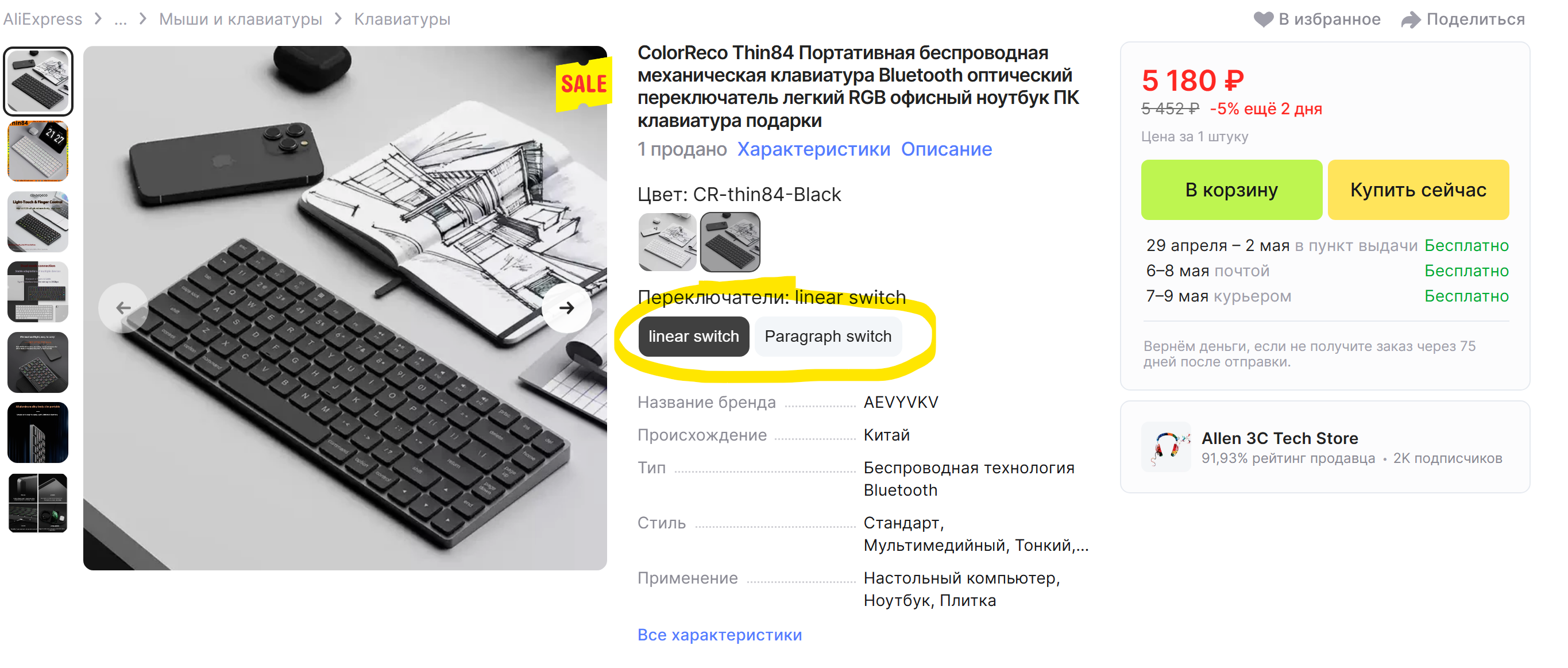 По клаве. Минусы. Взял низкосральные свичи, коричневые. Тактильность околонулевая, точнее, она есть, но сразу со старта. По факту, бамп почти не чувствуется, у черри коричневых лучше, буду менять на бесшумные. На стоковом поликарбонатном плейте флекса вообще нет, поменяю на полиформальдегидный. Хоть узнаю что это за брейн-рот фича. Ну и вцелом высота странная с низкопрофильными свичами: подставка как будто бы не нужна, но без неё не так комфортно, как с настоящей низкопрофильной в её качестве Лоджитеч ЭмИкс киз высутпила для сравнения. С полноразмерными свичами точно нужна подставка под запястья. ... Поменял на тихие. Короч, возможно, полноразмерынее тихие нарм, за счёт длины хода, но тут только разогнался а уже боттоминг. И за счет этого смягчения в конце не четкой обратной связи. И палец как будто бы даже сильнее давит. Но реально бесшумные. Но первые ощущения хуже мембранки. Такие ощущение, хз как передать, типа, как начинаешь с кайфовой тян сексом трахаться, но в каклй-то момень просыпаешься от того, что тразаешь простыню, так еще и не кончил. Или если ИРЛ начинаете секч и тя понимаешь, что ссать охота, но останавливатьчя уже как-то не готов, и вот с одной стороны секс, классно, но каждое нспряжение отдается в мочевом. Вот ⁰кактк-то такие ощущентя от низкопрофильных тихих свичей. ⁰ на неделе еще, может, адаптируюсь, я все время до этого на Cherry Clear сидел. Пока что есть ощущение, что низкосрал должен быть только на линейных. Для игорей возьму Эйр60 ХЭ, наверное, но это уже мае или июне.