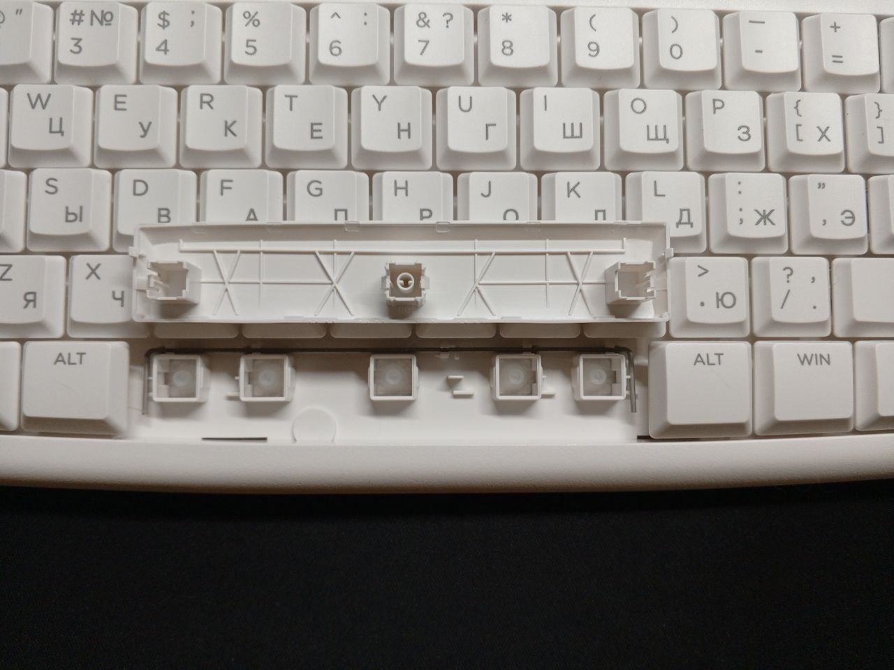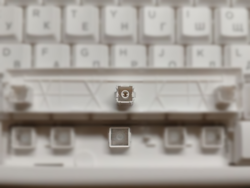 Всё-таки Джиниус неиронично гении, мало того, что белые клавиатуры они делали из нежелтеющего HIPS пластика, а под пробелом три точки активации, позволяющие собрать раздельный пробел, замок в хаузинге у низ сверху, а защёлки стема, упирающиеся в эти самые замки, не могут отломаться как на других клавиатурах из-за конструкции, всего этого Джиниусу показалось мало...