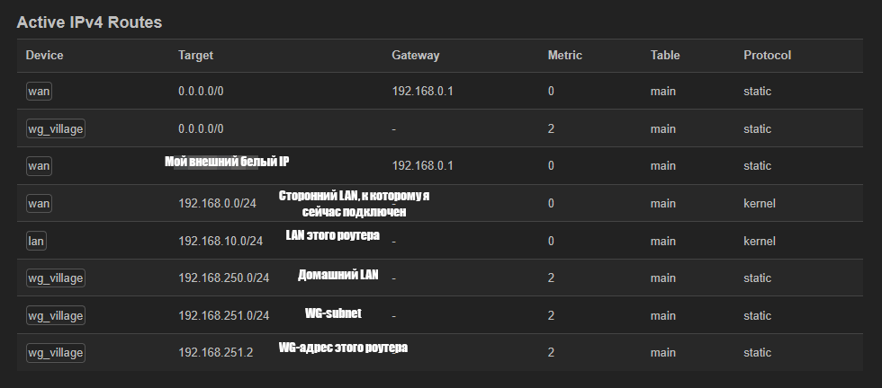 Теперь нужно в OpenWRT прописать роутинг в 192.168.250.0/24 (подсеть некротика) через 192.168.251.1 (интерфейс некротик-пира wireguard). Я же правильно логику понимаю? Но если в некротике мне все просто и понятно, то OpenWRT для меня пока какое-то адище. Поясните как зделоть заебись?