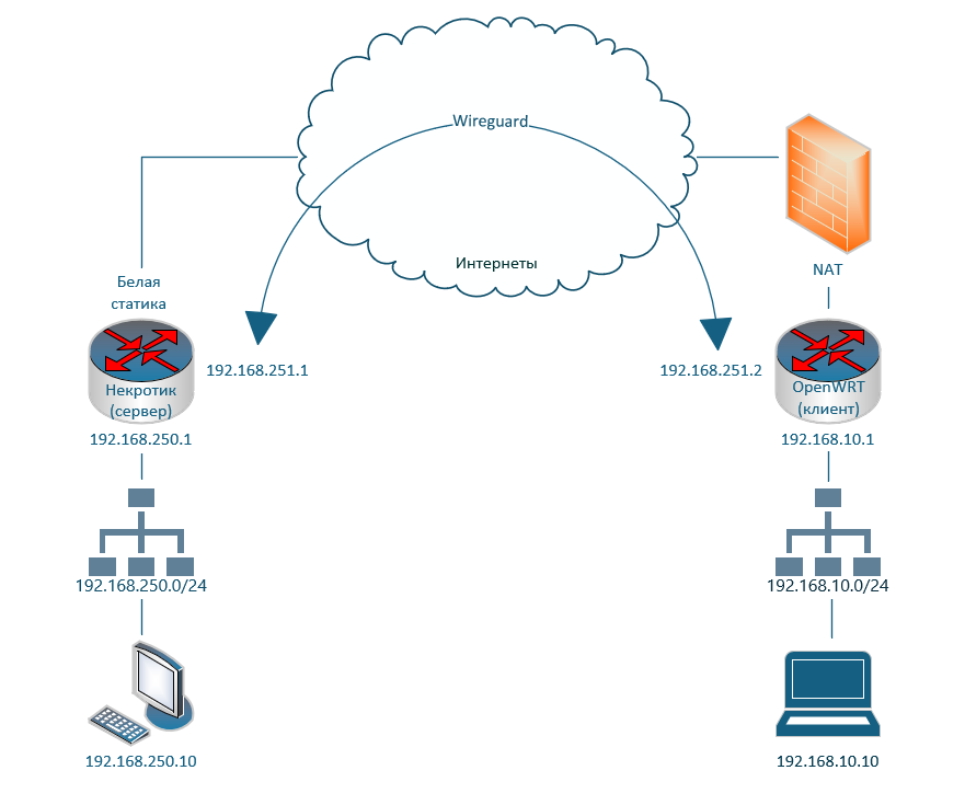 Некротик 192.168.250.0/24 с белым IP (сервер), wireguard-интерфейс 192.168.251.1/24 OpenWRT 192.168.10.0/24 за NAT (клиент), wireguard-интерфейс 192.168.251.2/24