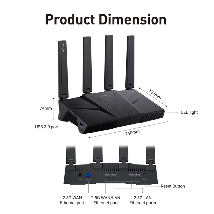 На корпусе устройства разместились пять портов Ethernet на 2,5 Гбит/с (четыре LAN и один WAN), разъём USB 3.0 для подключения модема или смартфона, а также четыре антенны. Устройство поддерживает работу в трёх диапазонах — 2,4, 5 и 6 ГГц с максимальной пропускной способностью 688, 2882 и 5765 Мбит/с соответственно. Кроме того, роутер может работать как ячейка Mesh-сети.
