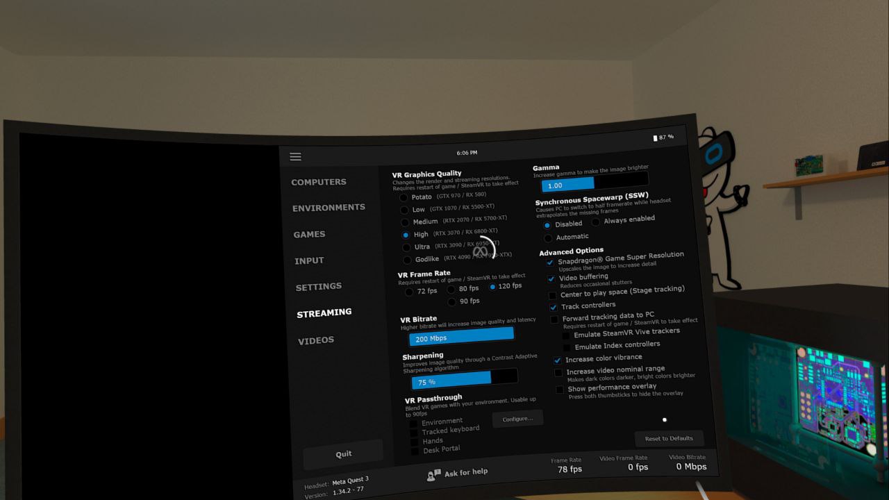 Сука, кукерберга в рот ебал. Нихуя не трогал по настройкам нигде. С этим v76 начало ебейше лагать через airlink и ALVR. Прям не то, что фпс низкий, а как будто со второго пенька играть пытаюсь. VD отвалился по причине нищеблядь. Я хз куда копать даже. Или сидеть ждать пока что-то пофиксят хуесосы-индусы, раз стреляться перестали?
