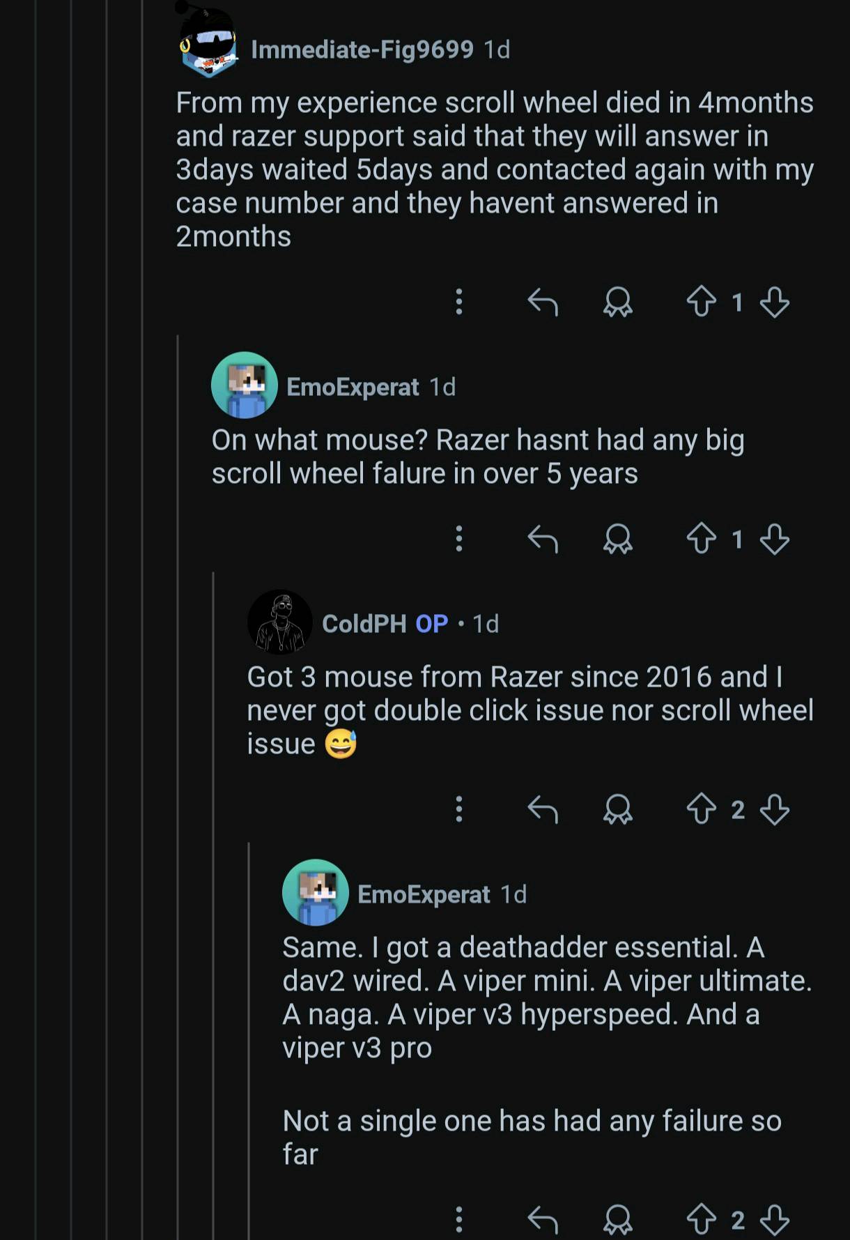 >>7387857 >колёсико ломается быстро Да, но это проблема ВСЕХ мышей с механическим энкодером, и дорогих и дешевых. Это только вопрос времени, когда он прикажет долго жить. Но в басилиске и g502x скролл оптический. Он не подвержен износу и если только вхлам не забъется мусором, то отказывать не должен теоретически >ПО устанавливает Хз, впервые слышу. Утилиту для мыши ты в любом случае установишь >глайды Это расходник