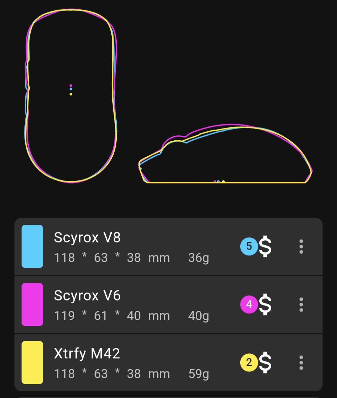 >>7392041 в6 - обмылок аля гпро горб по центру. в8 - горб смещен назад. 6 для средней руки. 8 для средней и большой подойдет. У 6 проеблись с высотой сенсора и фактический dpi выше на 7.5~% + возможно менее стабльные герцы. Вроде все.