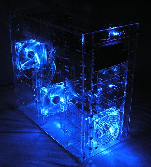 С середины десятых по начало двадцатых — прозрачные стенки, БП снизу под кожухом, многоцветная подствет_очка, сетка/стекло на морде