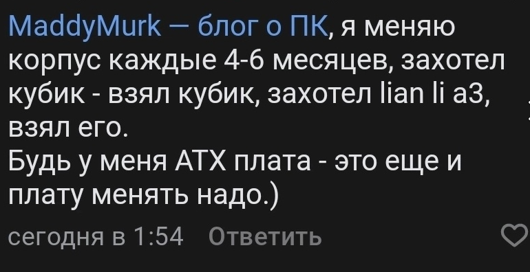 >>7417807 Годный корпус кстати, нет пластика, монолит, тупо толстый лист железа ебанули в круговую. Хули все так не делают? мне он не подошел из-за размера, а компактный вариант слишком глухой