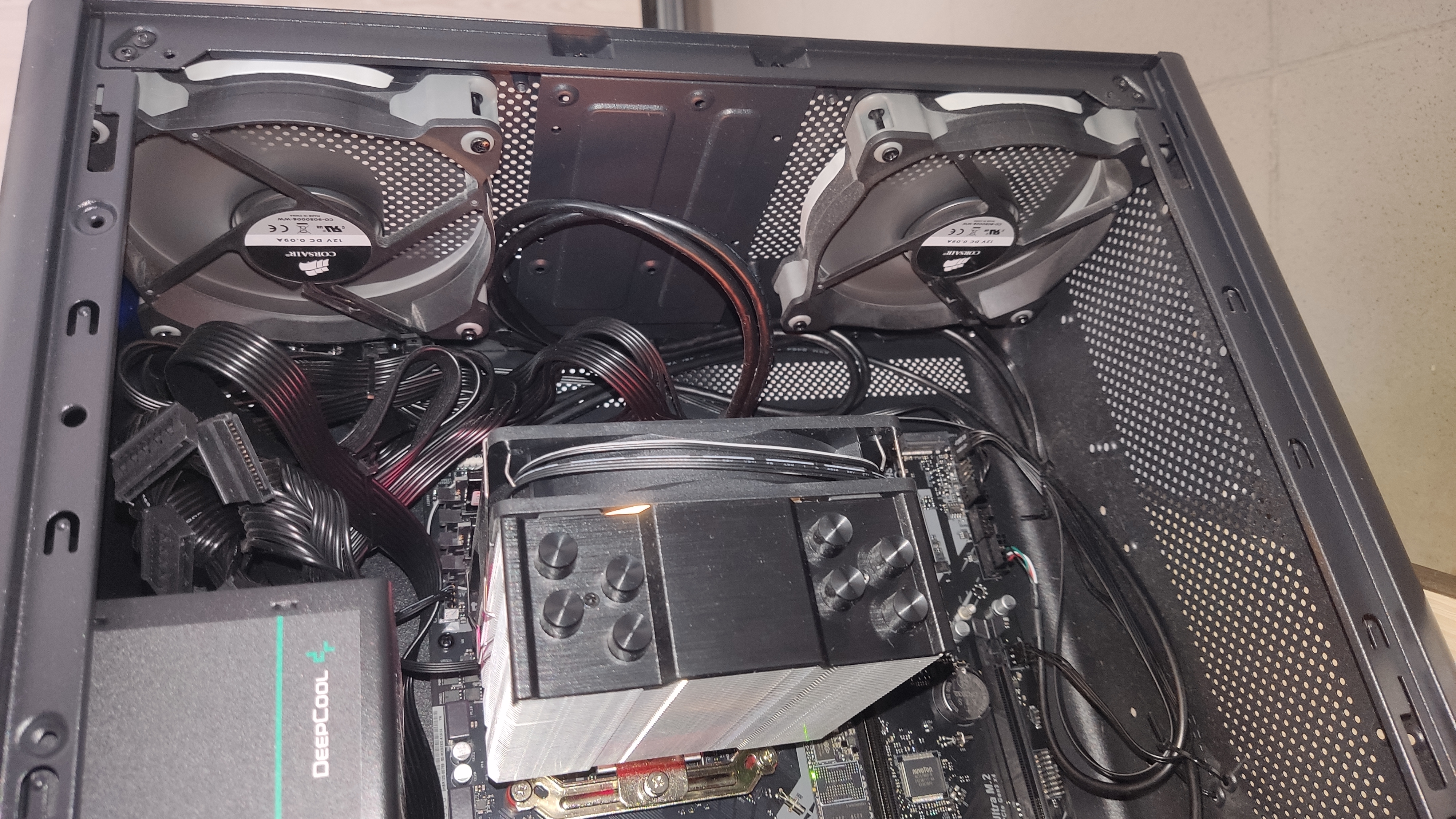 Пиздец. Дозаказал вентиль, перелопатил систему вентиляции, убрал чутка провода (не до конца, ну и хуй с ними пока что). В итоге комп отказался включаться. Я обосрался, начал перепроверять всё подряд, даже сделал тест скрепкой лол, а оказалось я просто не так присоединил JFP1 кабели (сука какой даун ёбаный решил их так расщепить на миллиард частей. В итоге всё заработало.