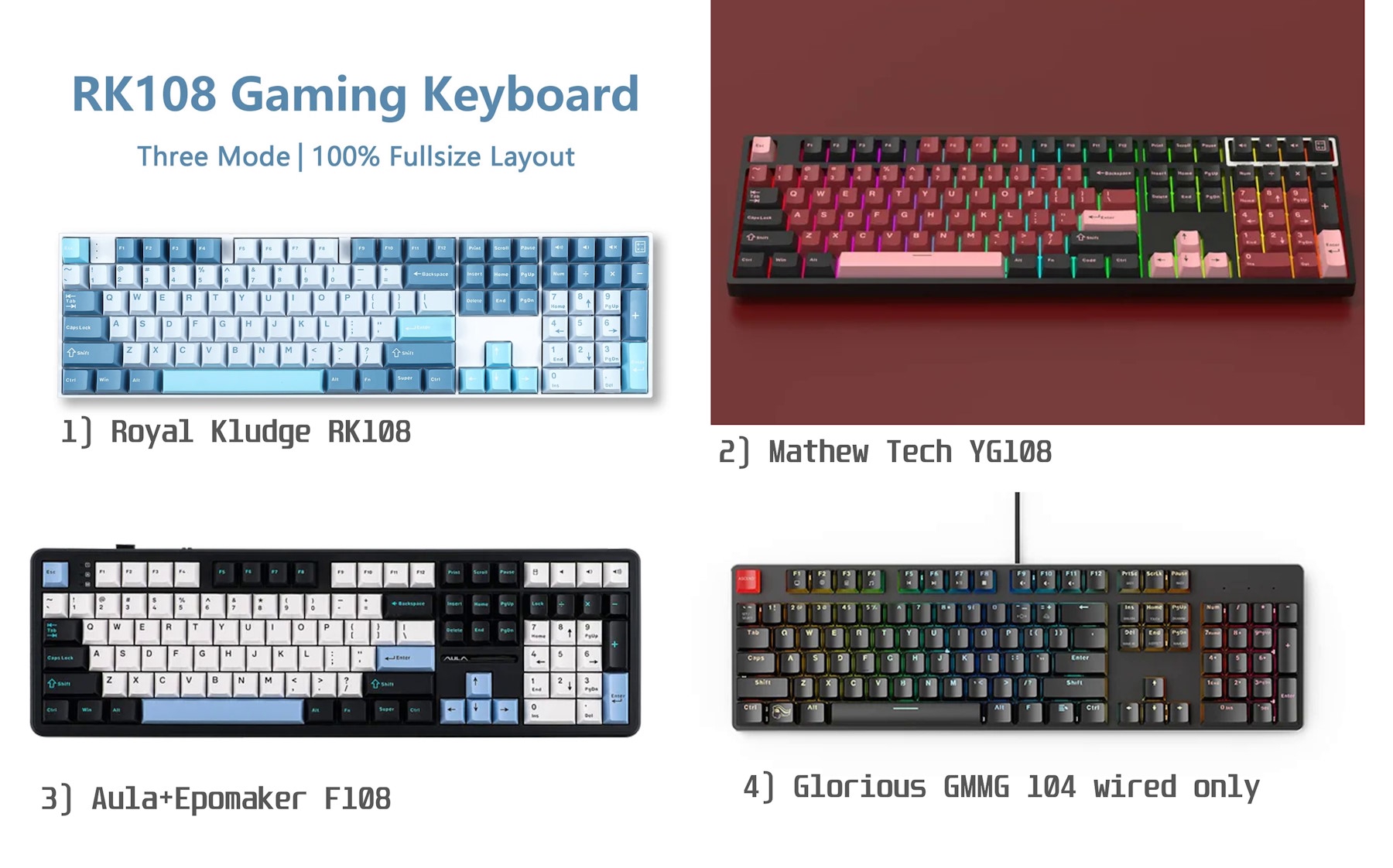 Требуется помощь зала. Что таки выбрать скаредному бомжу, хотящему себе максимум качества за минимум денег, из этих вариантов например: 1) Royal Kludge RK108 на Outemu Brown - 6 тыр. сразу годные PBT кепки. 2) Mathew Tech YG108 на Outemu brown или Jerrzi Kyria (не понял из характеристик какие именно) - 6 тыр. - кепки сразу годные из PBT 3) Aula+Epomaker F108 на Leobog Graywood V3 - 8 тыр Али или 7 Озон. Кепки PBT и сразу прямо хорошие (судя по фото). 4) Gloriuos пребилд Gmmk 104 на Gateron Brown - 7,2 тыр Али. Кепки 146% придется менять, т.к. по умолчанию там ABS-говняшки. Потому де-факто выйдет около 9 тыр.
