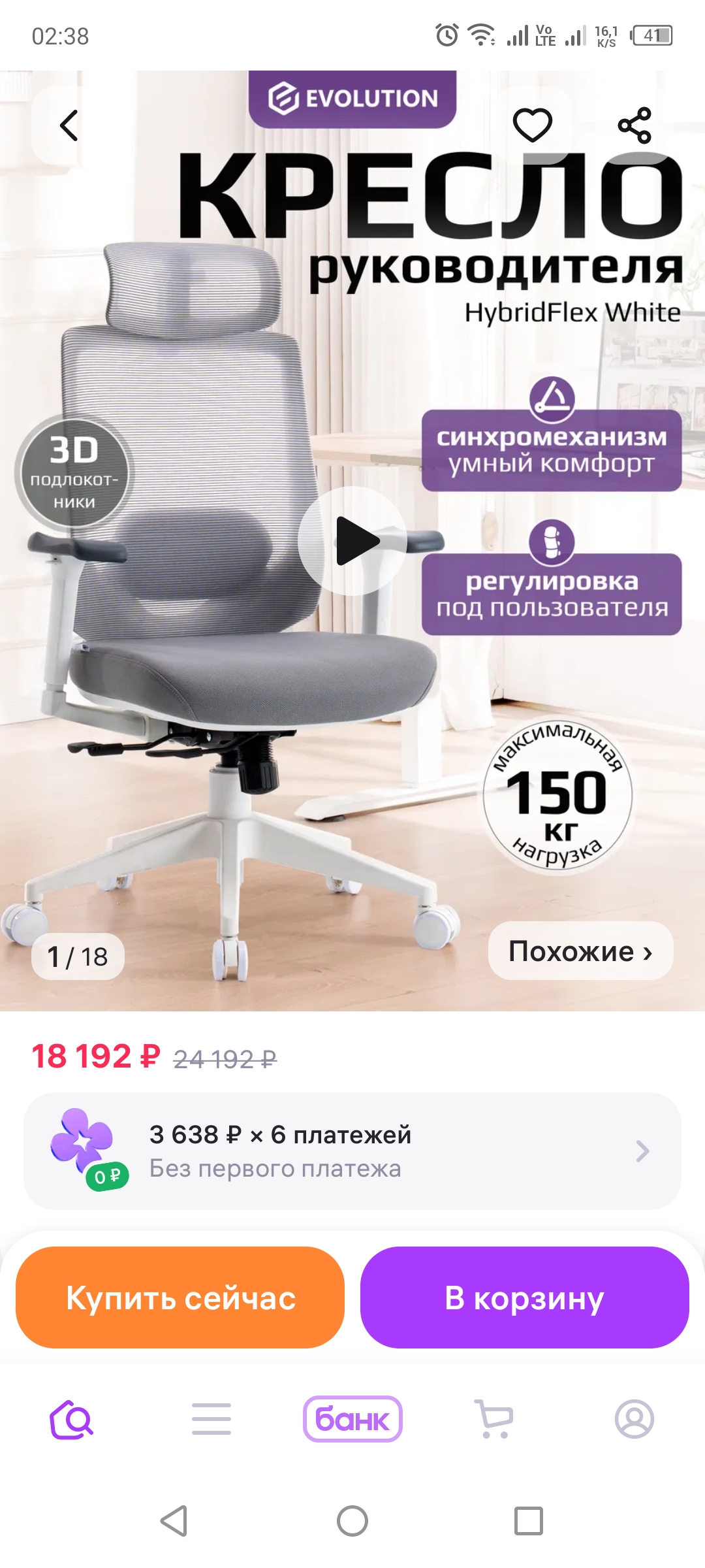 >>7420179 Минимальная высота подлокотника (если опустить его самого и газлифт стула) - 65 см, должно хватить. Регулировка спинки не сбивается, угол поворота подлокотников уже можно случайно дёрнуть, если слишком на них надавить. >>7419846 У этого другой механизм качания и ткань для сетки получше, я решил переплатить в надежде, что он не начнет скрипеть при использовании как предыдущий вафлет.