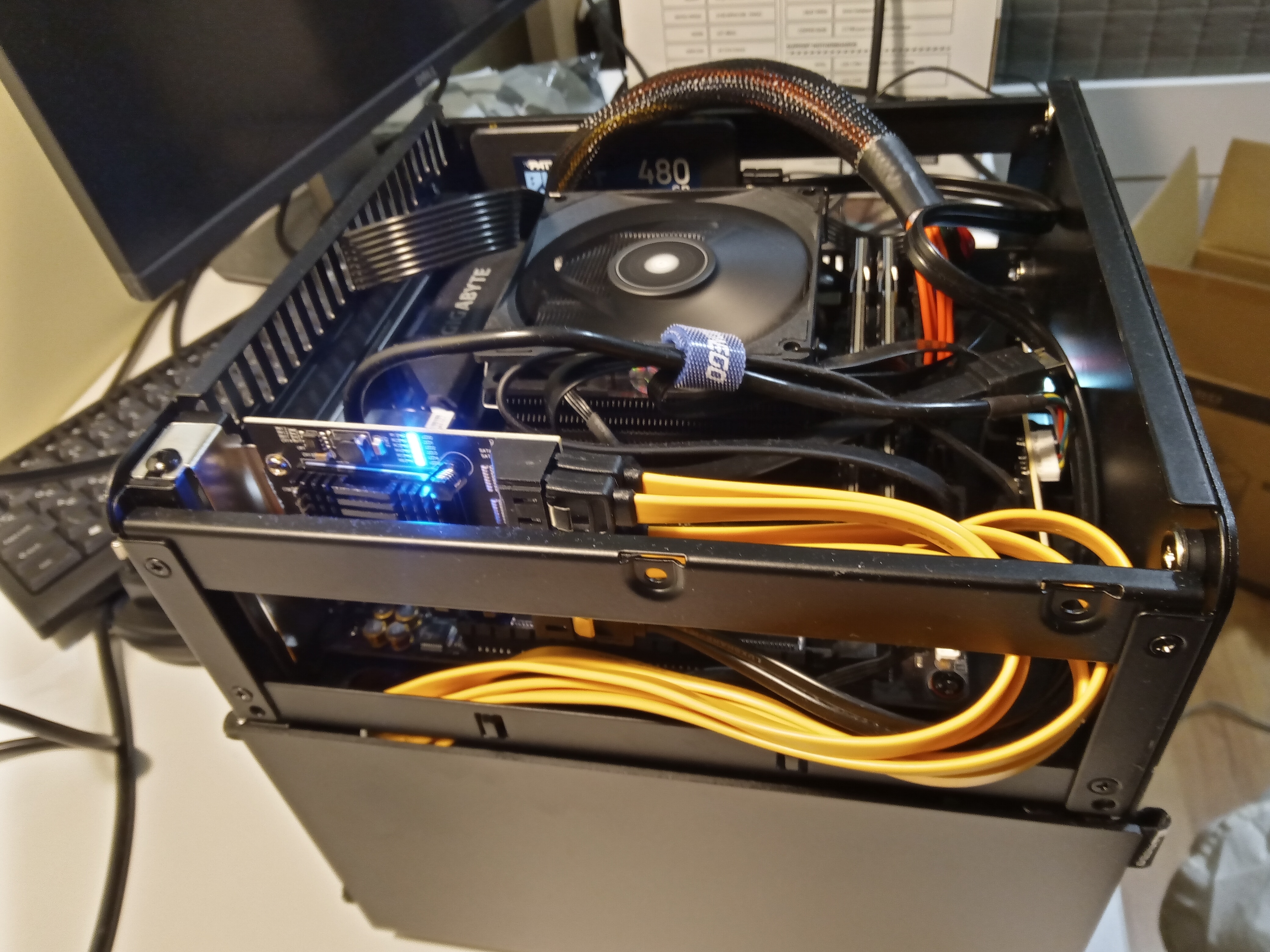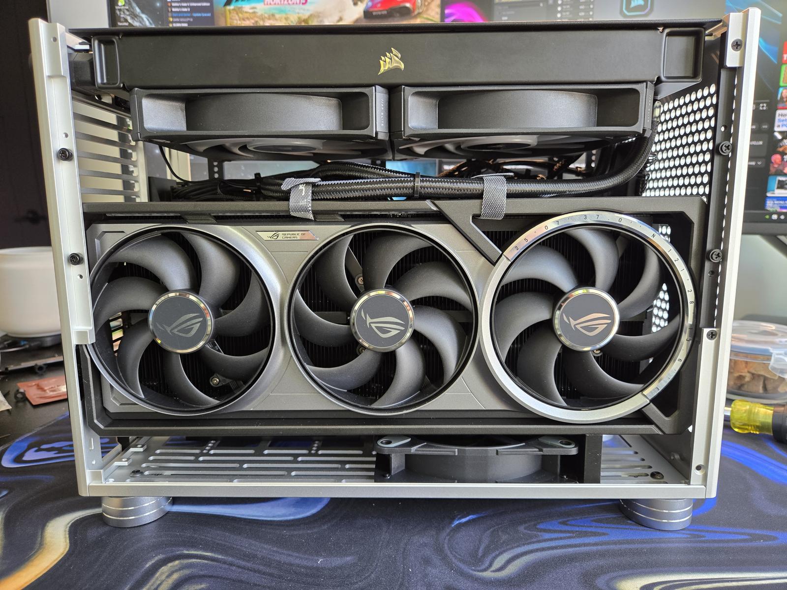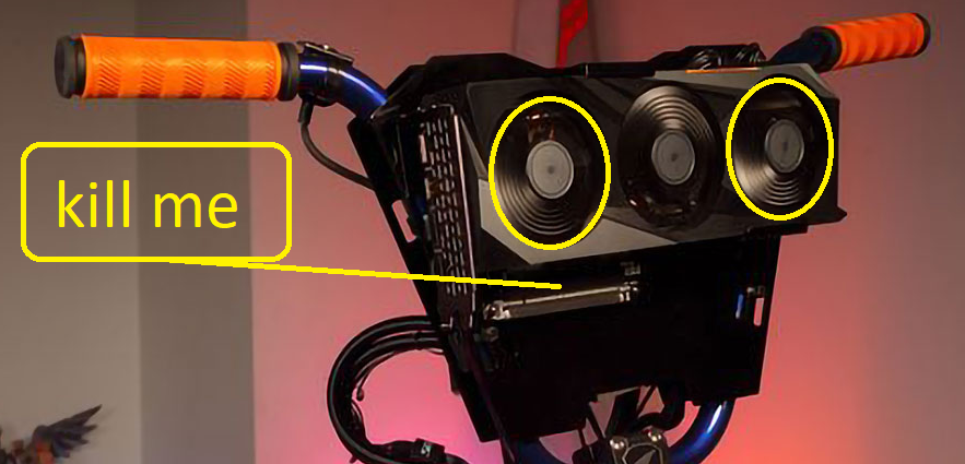 Два GPU не влезают (0 мм промежуток, нет воздуха). inb4 зачем - для LLM и рендеринга видео. 1. Решение: PCI-E шлейф-удлинитель, монтаж нижнего GPU на кронтшейн. 2. Проблема: в старом корпусе нет места под пикрило-подобный кронштейн.