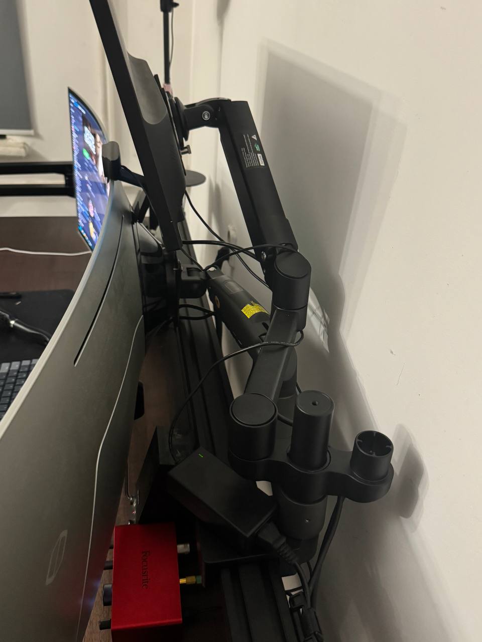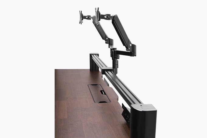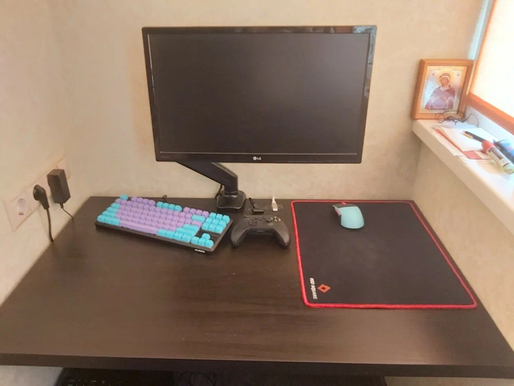Крепление к направляющей использовал родное, ультраширокий закрепил на не родную руку NB H100, а уже на родную руку поставил второй монитор. Прогиб есть но он очень небольшой- на уровне нескольких миллиметров. Сам стол достался новый мне за 37К, новый с магазина, урвал по большой скидке. В моем городе такой же 120к стоит. За такую цену слишком пиздатый