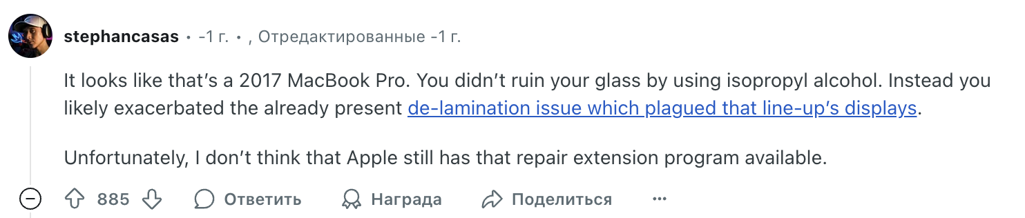 >>7432484 >>7432488 На старом макбуке снимал именно 99% изопропилом на микрофибре, процесс долгий, но результативный. До конца не оттёр, терпения не хватило