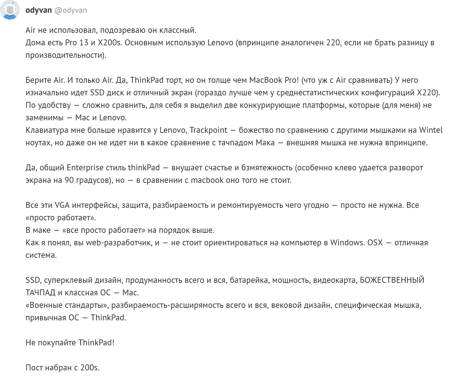 Макбук лучше по всем критериям (да даже просто ультрабук без выебонов лучше). Объяснить это просто — поставить рядом псинкпад и макбук, и все станет очевидно. Одни псинкпадочулочники отказываются признавать это.