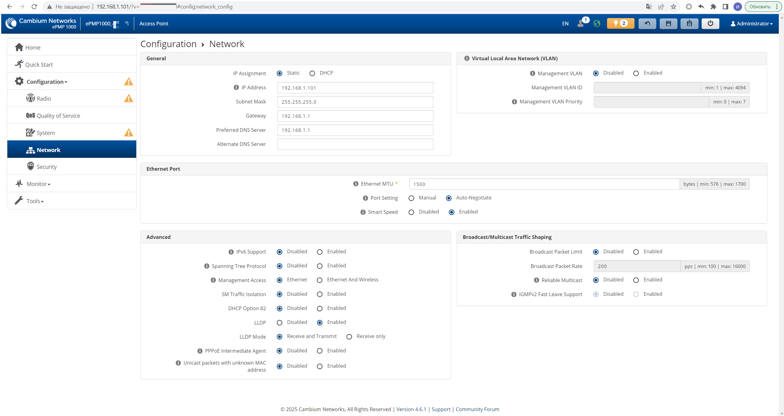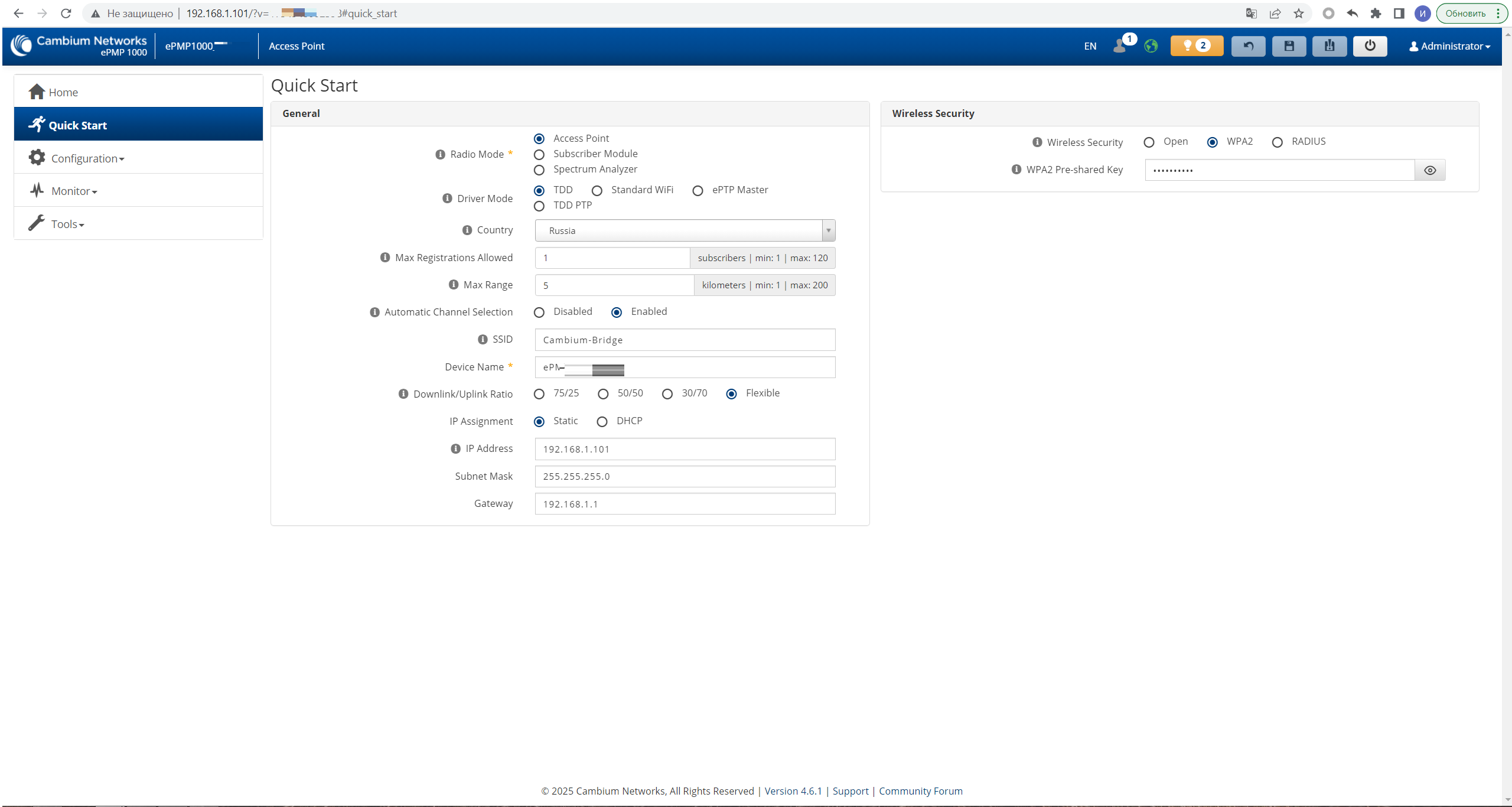 >Так и задумано? Да. Вся эта система замышляется как "последняя миля" для подключения, например, коттеджного посёлка к интернету. Абы кого в админку BS никто не хочет пускать. Если я правильно помню, была опция, чтобы это разрешить, но в домашних условиях я просто обычно ставлю BS в сторону компа, с которого будет вестись обслуживание. Это нужно, например, для обновления прошивок на устройствах: сначала ты обновляешь на дальнем от тебя конце, потом на ближнем к тебе. Кстати, по поводу прошивок — какая там у тебя версия? Я тебе новую пришлю.