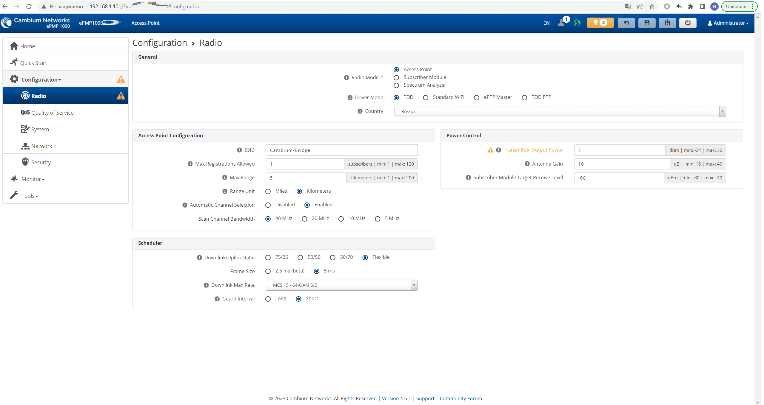 По поводу настроек, что бы в твоей ситуации я выставил. Driver Mode — ставь на TDD PTP, потому что у тебя не планируется третьего устройства. В этом режиме эффективность канала ещё больше повышается. Downlink/Uplink Ratio — с одной стороны, Flexible норм, а с другой, жёстко заданное соотношение повышает эффективность использования канала (сокращает количество служебных фреймов). Это на твоё усмотрение, можешь и оставить флексибл. Кстати, на третьем скрине я и нашёл опцию для доступа в админку по радио. Management Access — ethernet and wireless выставляй. В остальном вроде ничего нет необходимости больше настраивать, если тебе нужен просто ip-канал. Какой уровень сигнала получился на сабскайбере и на BS от него, -60 и лучше?