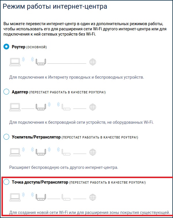 >>7474319 Ретранслятор - режим для всего, что не роутер. Там при первоначальной настройке после переключения, емнип, можно выбрать что тебе нужна конкретно точка доступа.