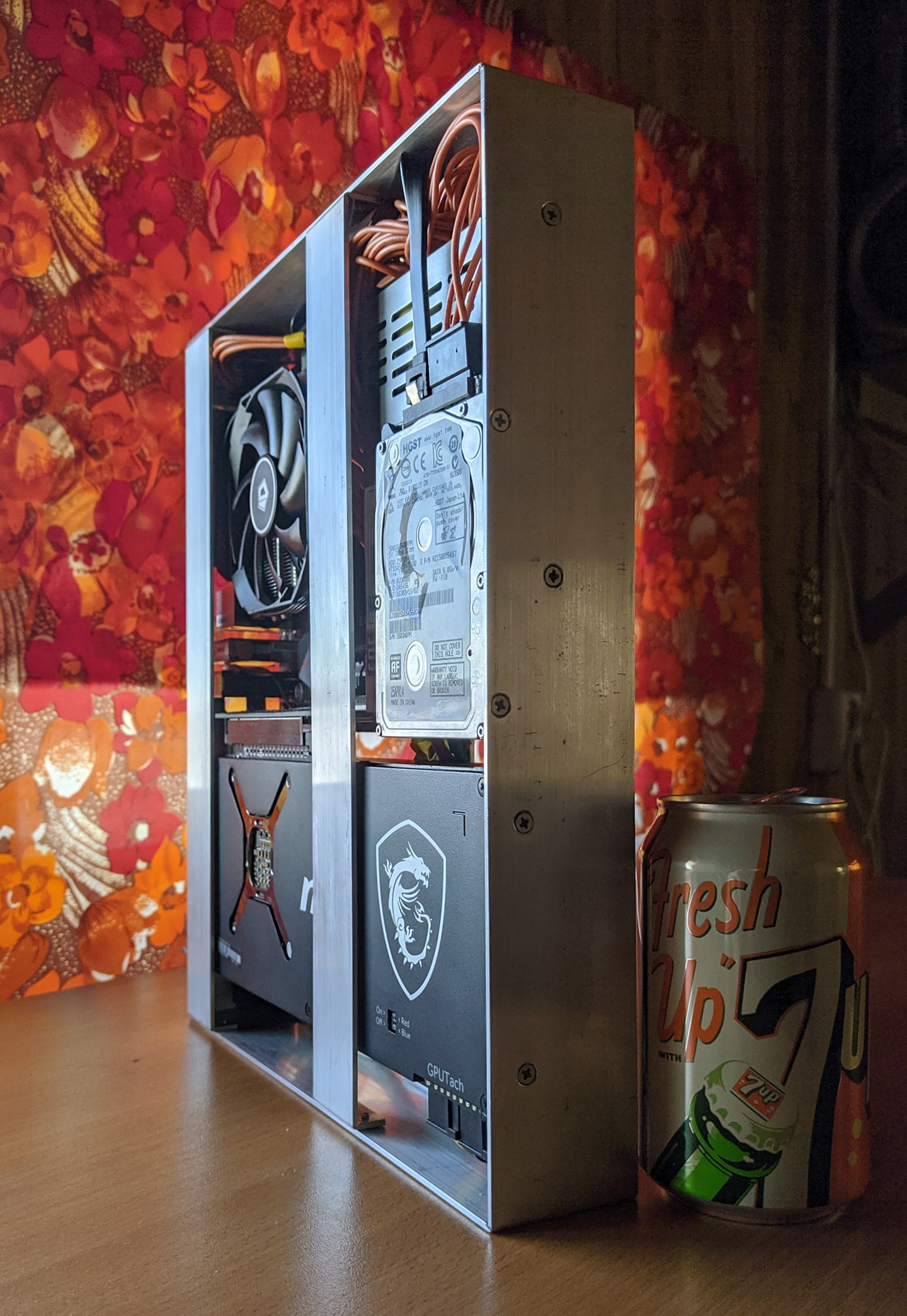 >>7449769 А про тонкость: я тогда мотался между городом и лесом. Месяц там, месяц тут, нужно было чтоб пека в рюкзак влезала. Примерно с год эта хуйня работала нормально, пока не начались проблемы с бп. 50мм В толщину Чуть больше 4-х литров объём, и это с референсной карточкой. Оно реально было очень компактным. Там ещё два харда сзади поместилось, за видяхой. Фоток не осталось.