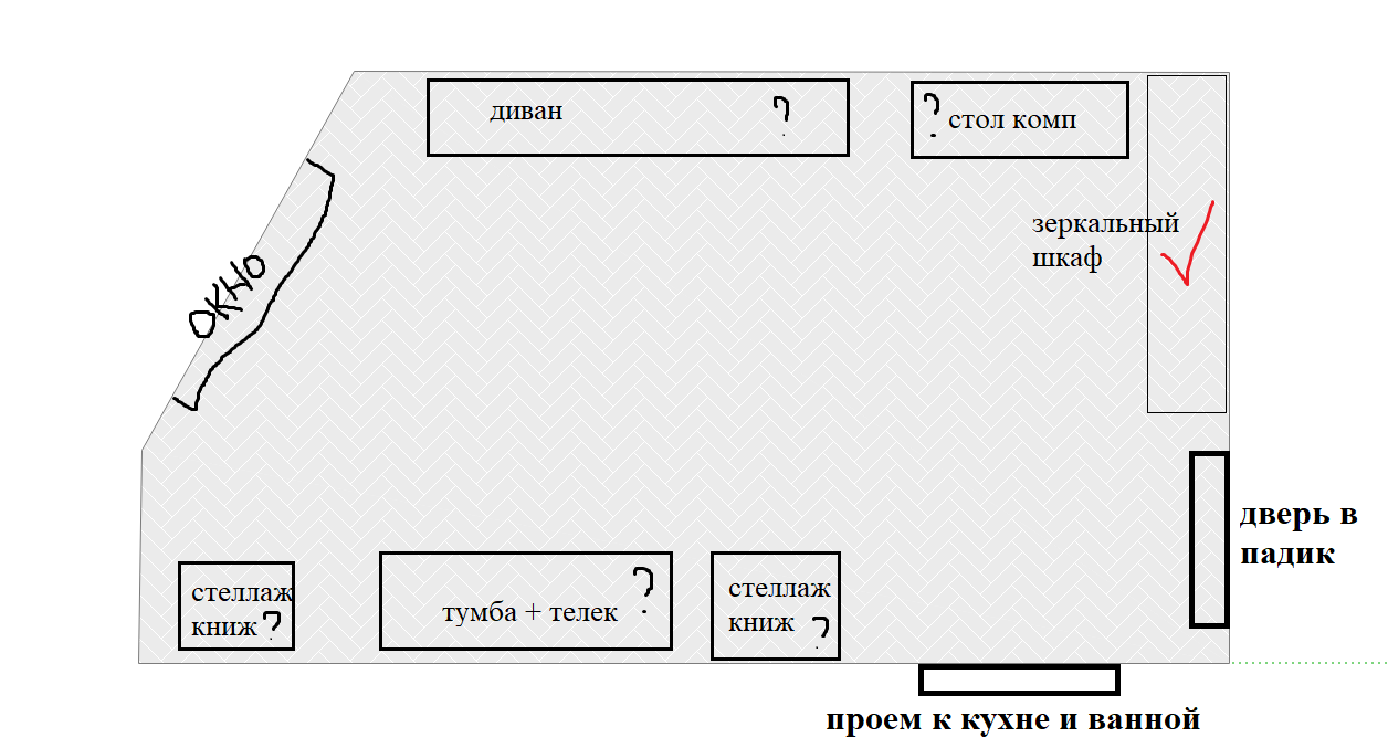 аноны с уютными сычевальнями, нужны ваши советы имеется хата с косой стеной, отсутствием прихожей и некоторой мебелью. места не оч много, площадь чё то в районе 16 квадратов, надо как то и стол с компиком уместить и диван с тумбой под телек. ну и со светом чё то намутить, чтобы не темно было. окно на восток выходит, после обеда уже темновато становится. во всю стену одну зеркальный шкаф имеется распашной, туда большую часть вещей можно складировать. накидал схему в пейнте. за ваши ценные советы с меня, как обычно, нихуя