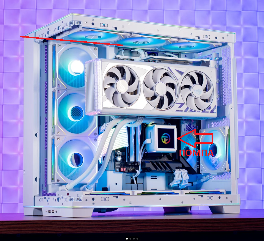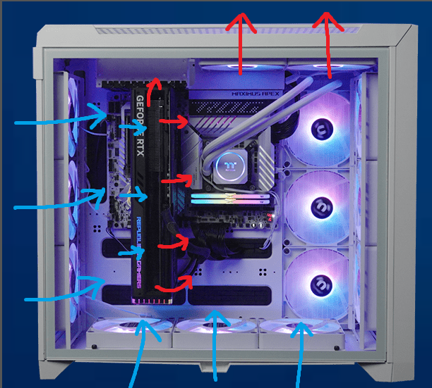 А как тогда вентиляторы размещать? Верхние придётся ставить на вдув, а не на выдув, иначе видеокарта сдохнет Нижние тоже на вдув? Задний на выдув А передние боковые где водянка будет куда? На вдув или выдув? Получается у меня 9 вертушек на вдув и 1 на выдув будет, а не дохуя ли? Придётся воду на выдув ставить?