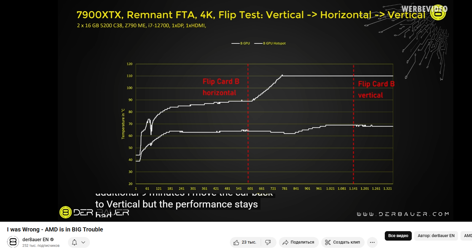 >>7468204 Лол, короче начал гуглить твою хуйню и оказалось всё наоборот вапор чембер НЕ работает при стандартном расположении(горизонтальном), зато работает при вертикальном На 7900XTX массовый брак был с этим, когда карты горели 110 градусов из коробки У дербауэра даже видео есть