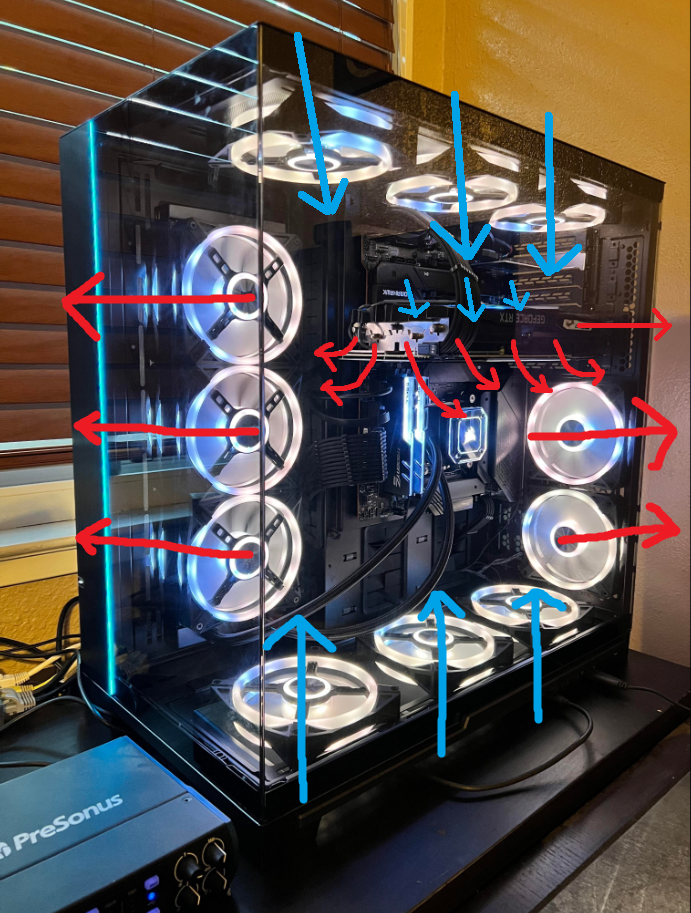 >>7470600 >он обратно поднимается Да не поднимается он нефига ИРЛ там 1 мм в сутки без помощи вентиляторов/давления Пока что вот так получается 3х140мм корпусных богатыря засасывают холодный воздух сверху прямо на видеокарту 3х94мм богатыря видеокарты засасывают холодный воздух в себя сверху и выпускает горячий воздух направо, вниз и налево. 2x120мм корпусных богатыря сзади высасывают горячий воздух от видеокарты прочь из корпуса 3х140мм корпусных богатыря засасывают холодный воздух снизу для конвекции 420 AIO водянку тогда придётся ставить на выдув, тогда она в том числе будет охлаждать видеокарту, засасывая в себя её горячий выхлоп.