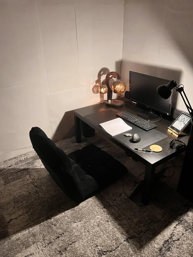 >>7472455 >сидеть на полу без стула и стола? В позе "спина колесом" и высоко висящими в воздухе локтями и оче изогнутыми запястьями? Ну такое себе. Хотя бы чайный/кроватный столик себе раздобудь - хоть рукам удобнее будет. А по хорошему - напольный сетап выглядит как-то так.