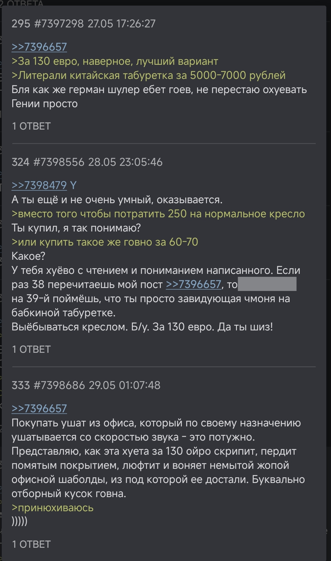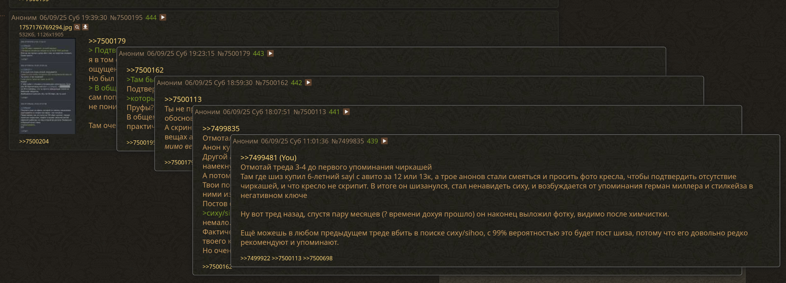 >>7499835 Отмотал, некоторые моменты не сходятся с тем, что ты написал. Анон купил б/у кресло, цена вообще была указана в евро. Откуда ты взял 12 или 13к и Авито - непонятно (ну, теперь-то мне уже всё понятно). Другой анон (теперь мне тоже понятно, кто) почему-то начал исходить на говно, яростно требуя фото и видео. Ещё два анона с таким же креслом намекнули тебе, что ты перестарался, анон с креслом задал им пару вопросов. А потом и другие аноны из треда начали задавать вопросы, что тебя так задело, в чём причина твоего поведения. Твои посты очень характерны ненавистью к креслам известного бренда. Ты ещё очень рад, что откопал три фотографии с поломкой и носишься с ними из треда в тред, или с обычным для тебя утверждением, что всё обязательно сломается. Постов с рекомендациями >сиху/sihoo немало. Фактическое положение вещей достаточно сильно расходится с тем, что ты написал. Аноны, кстати, неоднократно просили у тебя фотографии твоего кресла, но все неудобные посты ты игнорируешь. Но очень интересно.